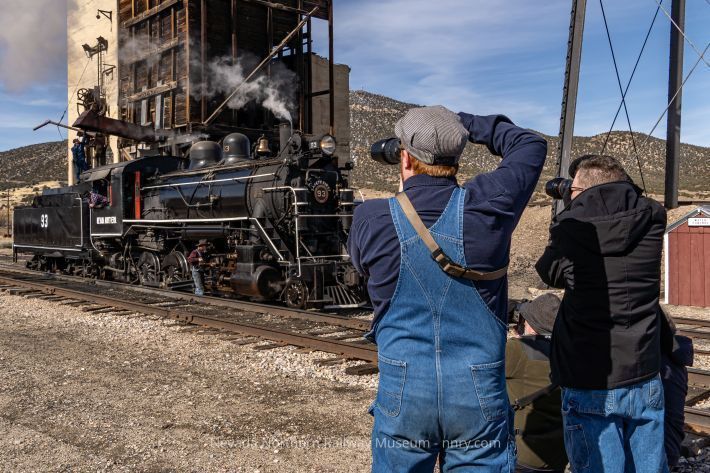 Photographers shooting locomotive #93 at the coaling tower, February 2024. Con Trumbull on the tender, Michael Hughes in the cab window, Will Ebbert next to the locomotive. Ben Kuhns (left) and Mike Masse standing with backs to camera.Photograph Details