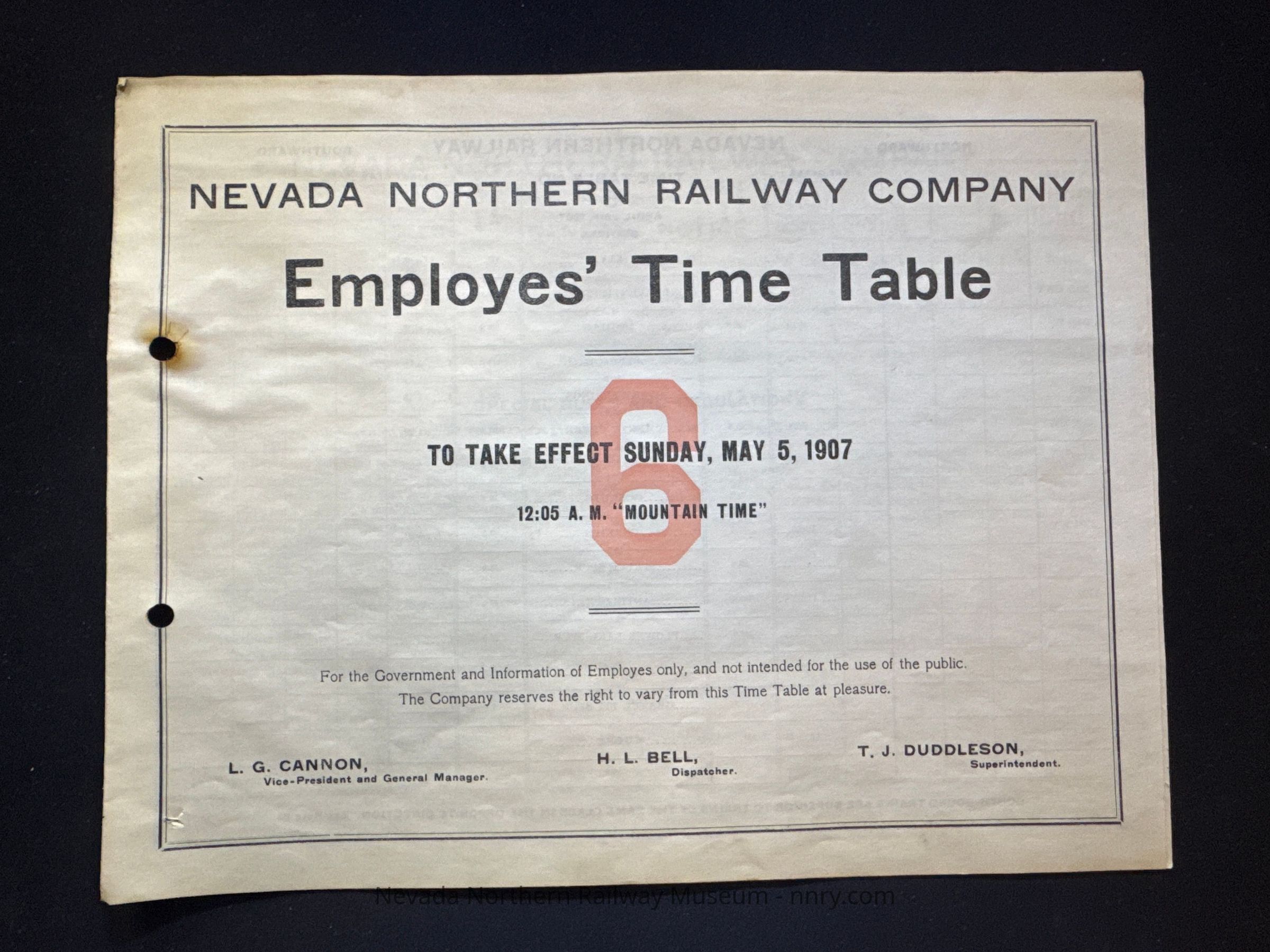 Nevada Northern Railway timetable no. 6, showing schedule between Cobre and Ely, May 5, 1907.