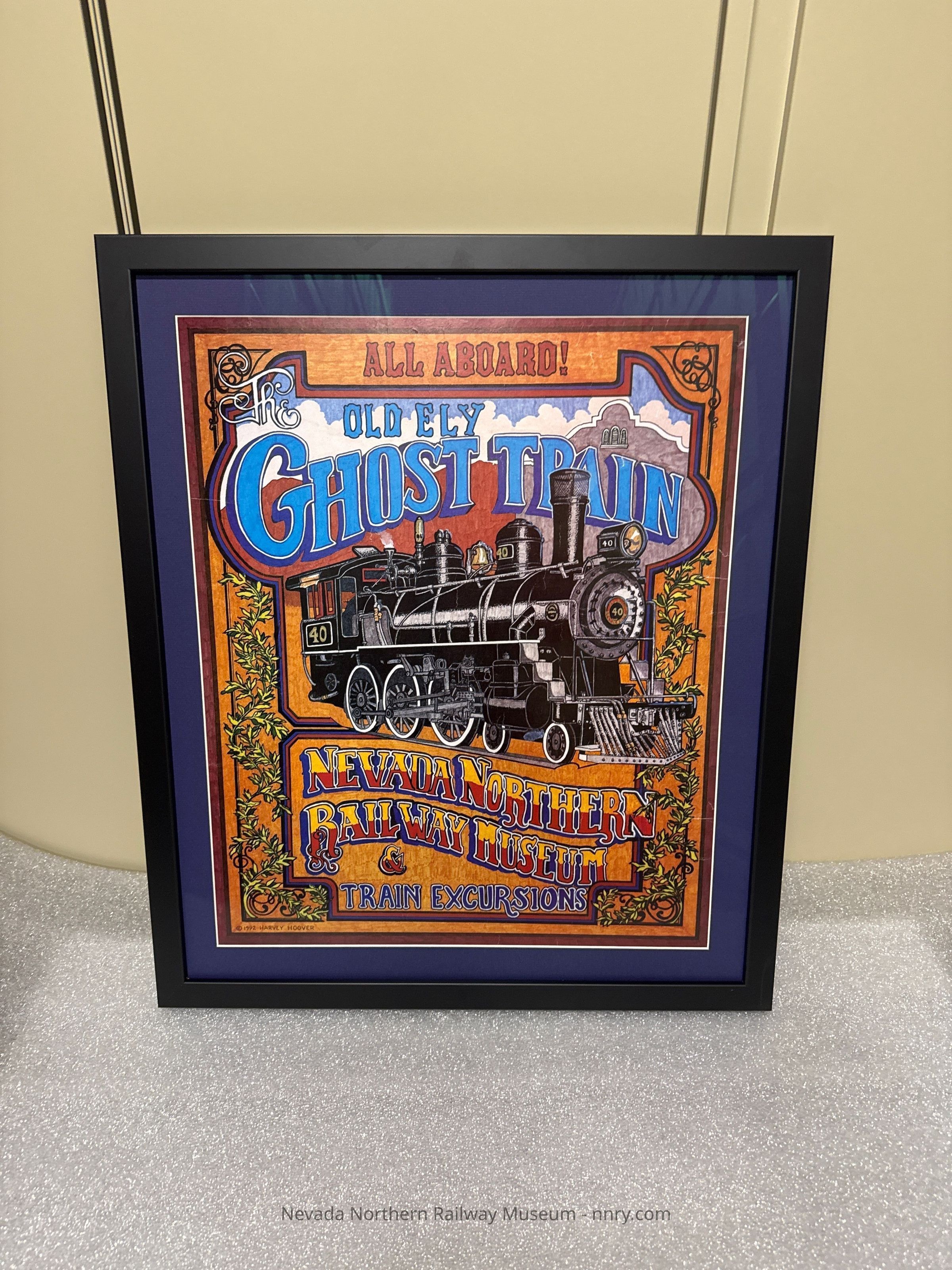 Artistic poster of locomotive #40 "The Old Ely Ghost Train," in frame, Harvey Hoover, 1992.Collection