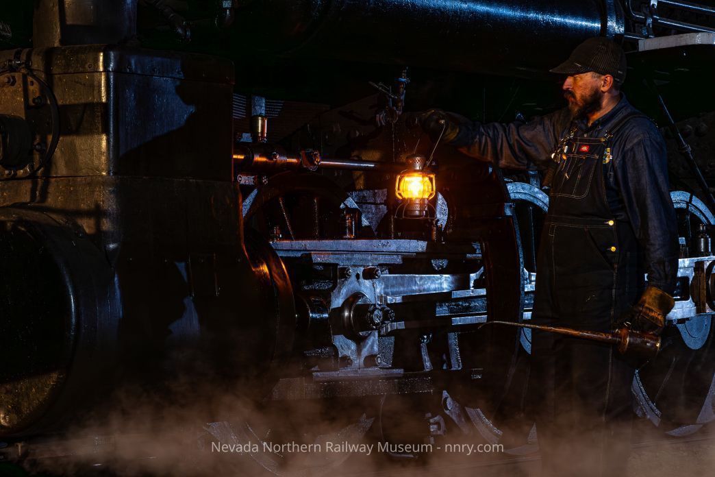 Fireman Vince Whiteley inspects and oils locomotive #93, February 2024.