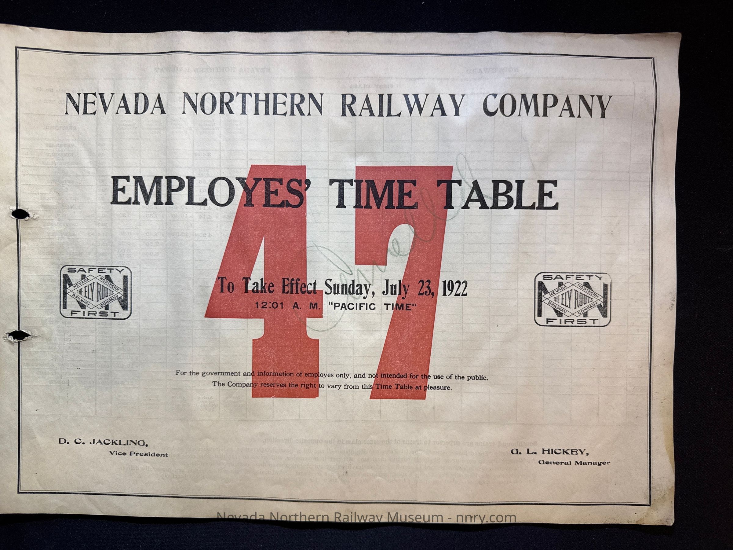 Nevada Northern Railway timetable no. 47, July 23, 1922.
