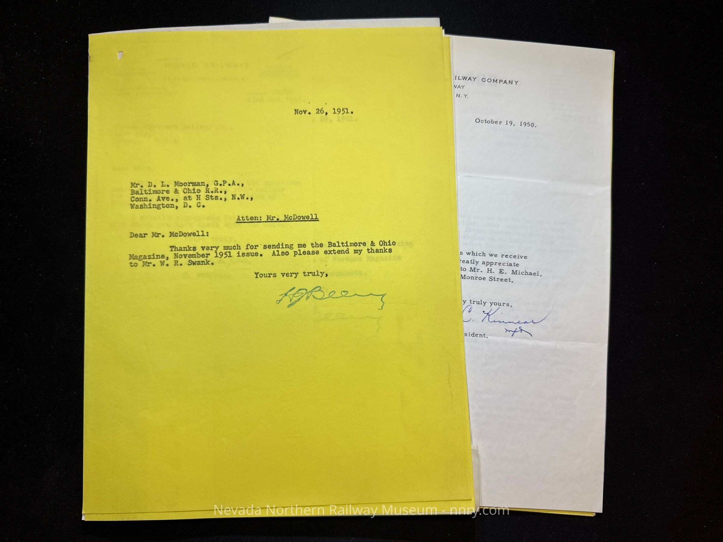 Correspondence thanking Mr. McDowell for a copy of the November 1951 issue of the Baltimore & Ohio Magazine, and a thank you to W.R. Swank, November 26, 1951.Creator