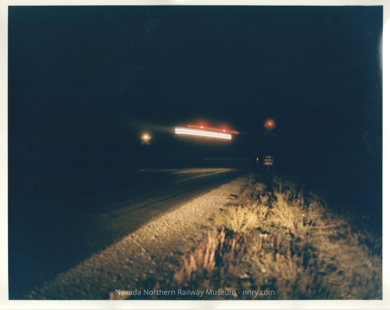 Wig wag crossing signal on the highway crossing at McGill with swinging signal replaced by a beacon light at night, October 1965.Photograph Details