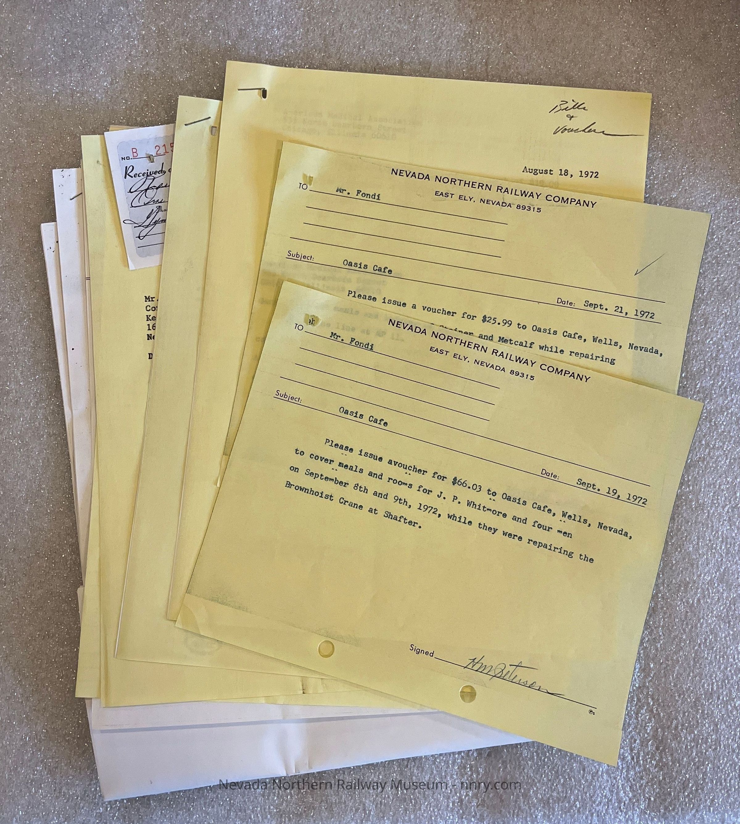 Memo requesting a voucher to cover meals and rooms for the Oasis Cafe in Wells for J.P. Whitmore and his crew while they were repairing the Brownhoist Crane at Shafter, September 19, 1972.Creator