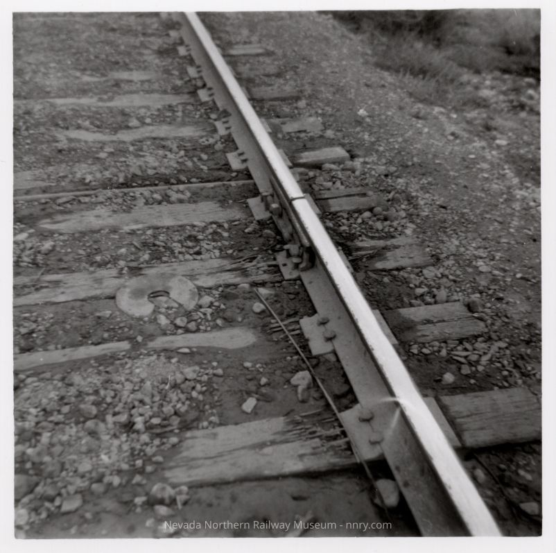 Poor condition of track about 1/2 mile west of the highway overpass west of tunnel No. 1, on tangent track, minimum wear shown on joint, better drainage of roadway, note the destruction of ties due to derailment. Each tie marked by a derailment has its service life shortened, even though it remains in service, a conservative estimate is a loss of $0.50 for each tie marked but left in service for each derailment, from a report by Harold E. Grier, 1967.Photograph Details