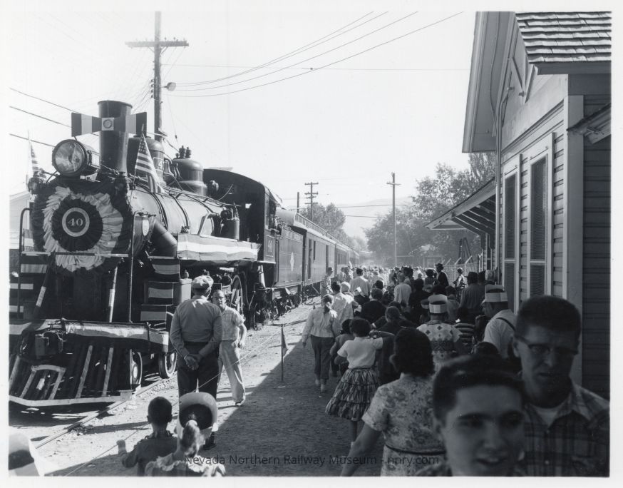 Locomotive #40 arriving with the 50th Anniversary excursion train at the Ely depot, September 1956.