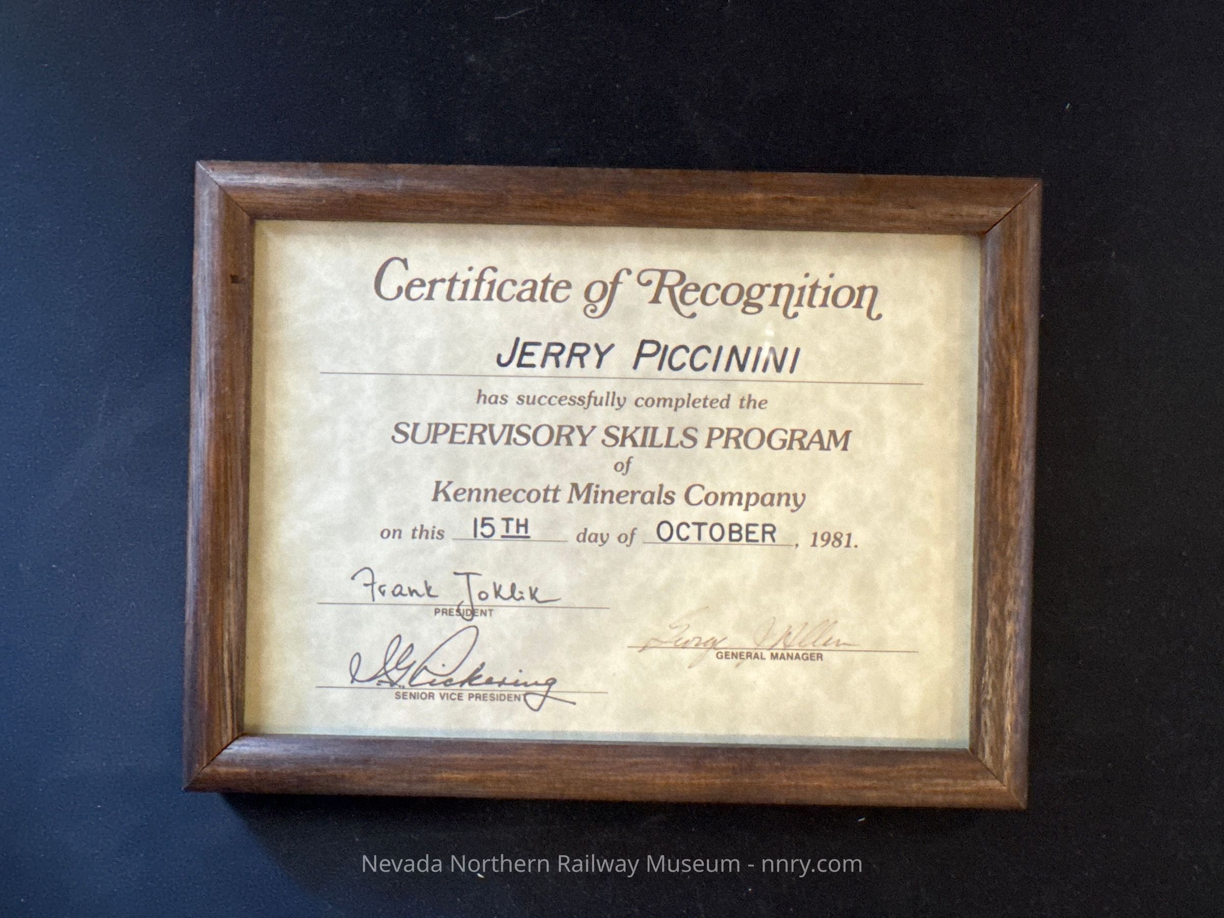 Certificate of Recognition presented to Jerry Piccinini for completion of the Supervisory Skills Program, October 15, 1981.Category