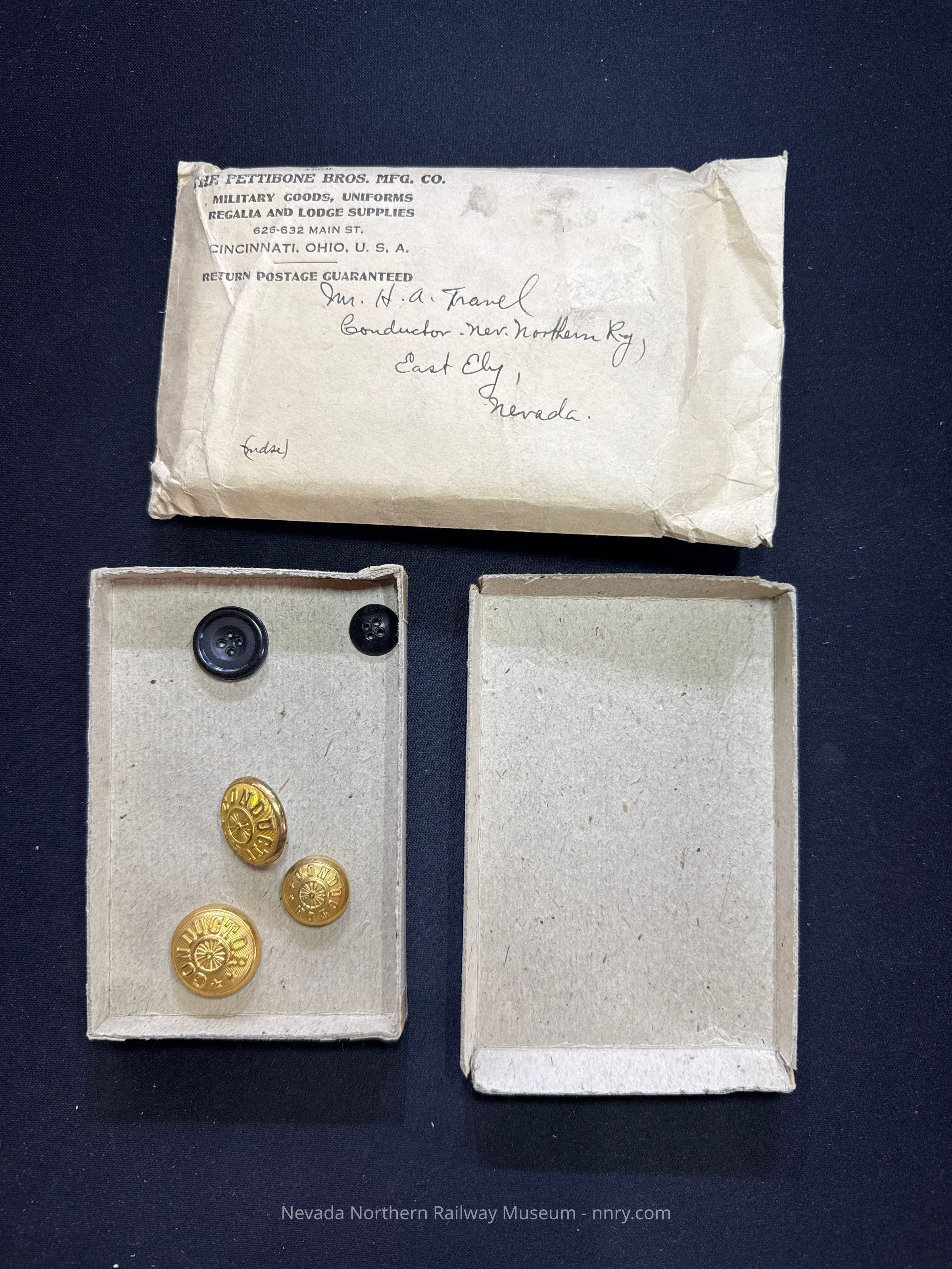 Packet containing a box of conductors' buttons from the Pettibone Bros. Manufacturing Co. addressed to H.A. Fravel, Conductor, NNRy, circa 1910s. Box contains two large gold buttons, one small gold button and two black buttons. Buttons stamped "Conductor" around a wheel with two stars.Acquisition