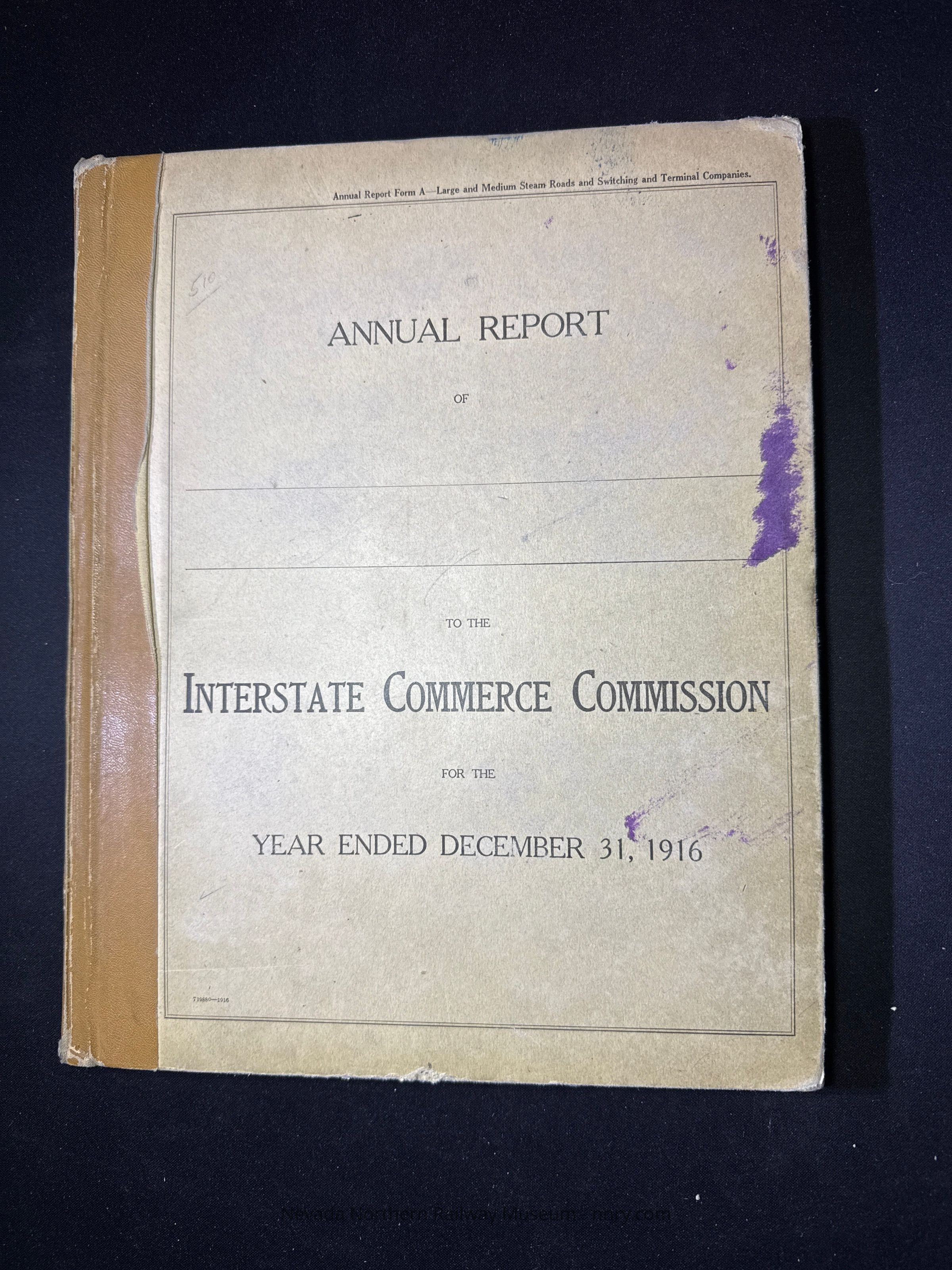 Annual report from the NNRy to the ICC for 1916, includes additional sheet of information between the pages, office file copy for the Auditor's office in East Ely.Creator