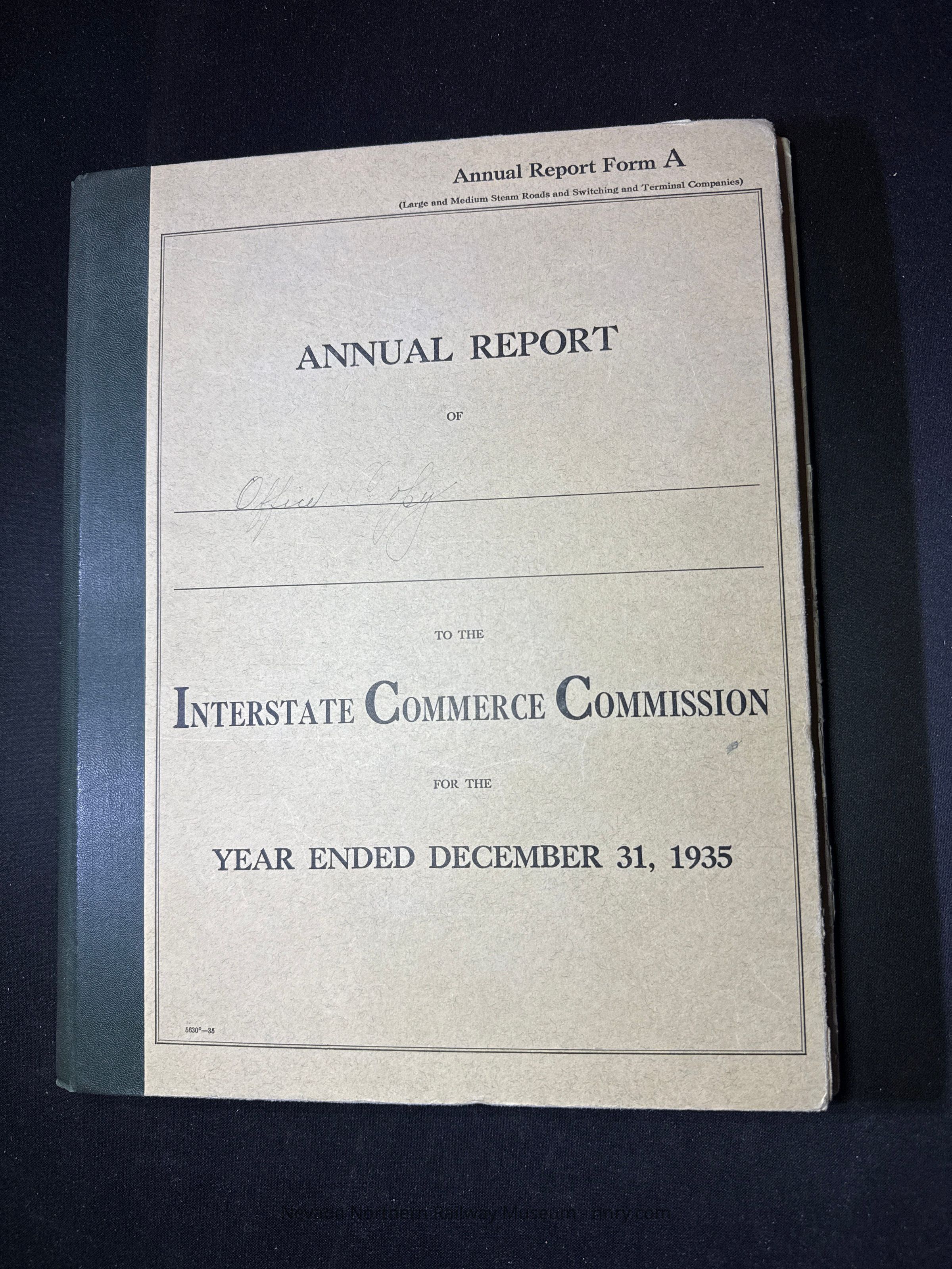 Annual report from the NNRy to the ICC for 1935, includes additional sheet of information between the pages, office file copy for the Auditor's office in East Ely.Creator