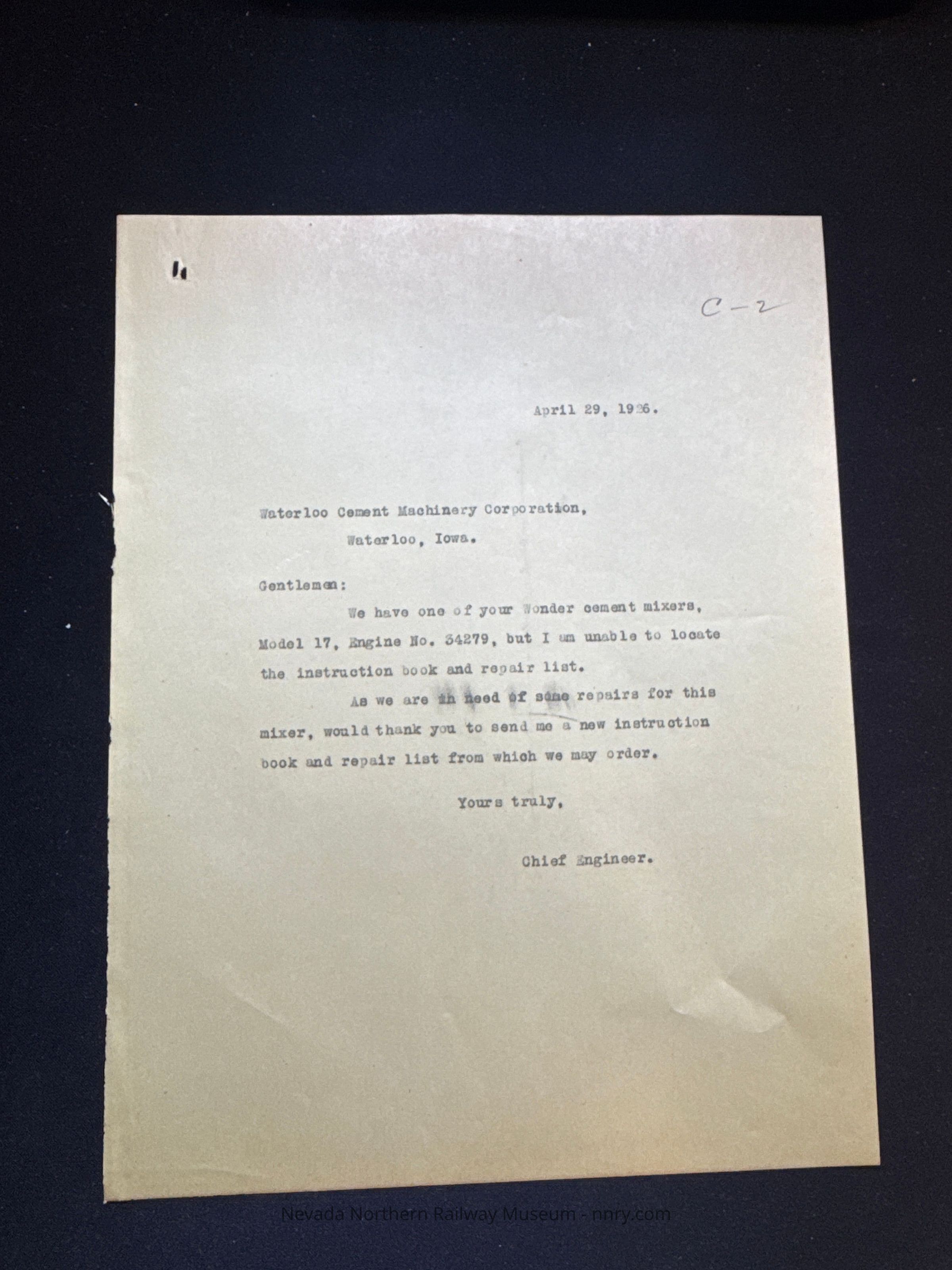 Correspondence requesting an instruction book and repair list for a cement mixer from the Waterloo Cement Machinery Corporation, April 29, 1926.