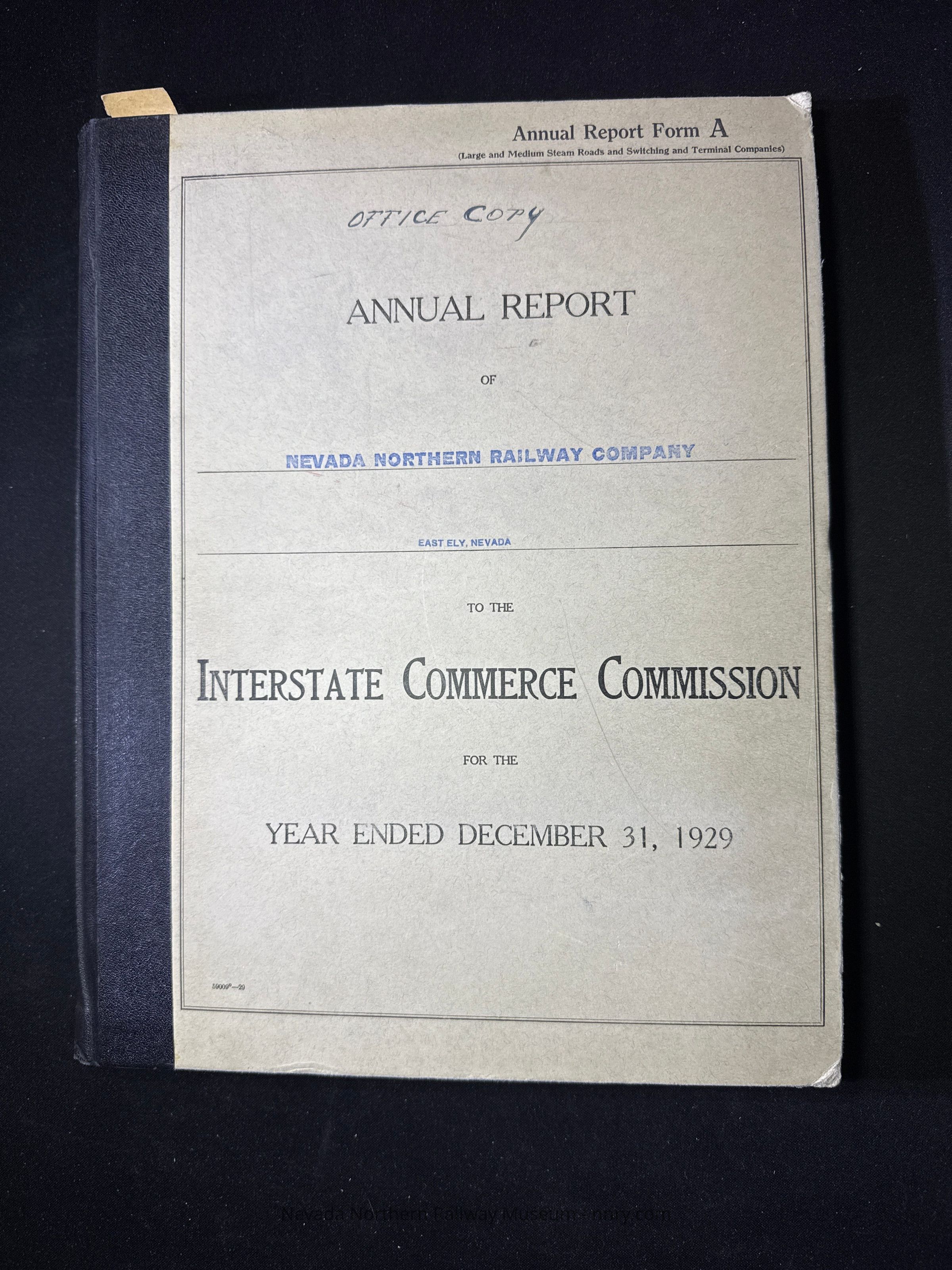 Annual report from the NNRy to the ICC for 1929, includes additional sheet of information between the pages, office file copy for the Auditor's office in East Ely.Creator