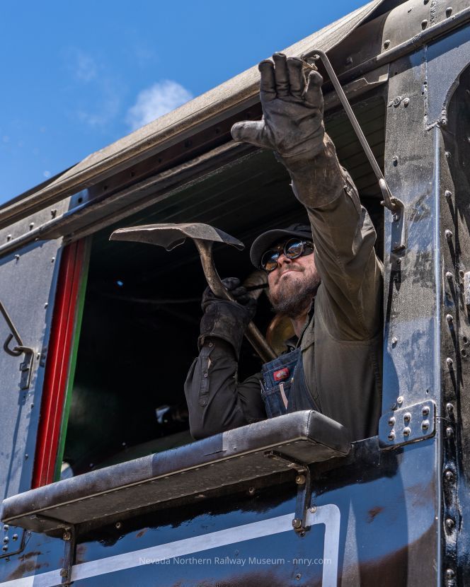 "Dueling crewmember" Fireman Josh Haufle on locomotive #81, July 1, 2022.Photograph Details