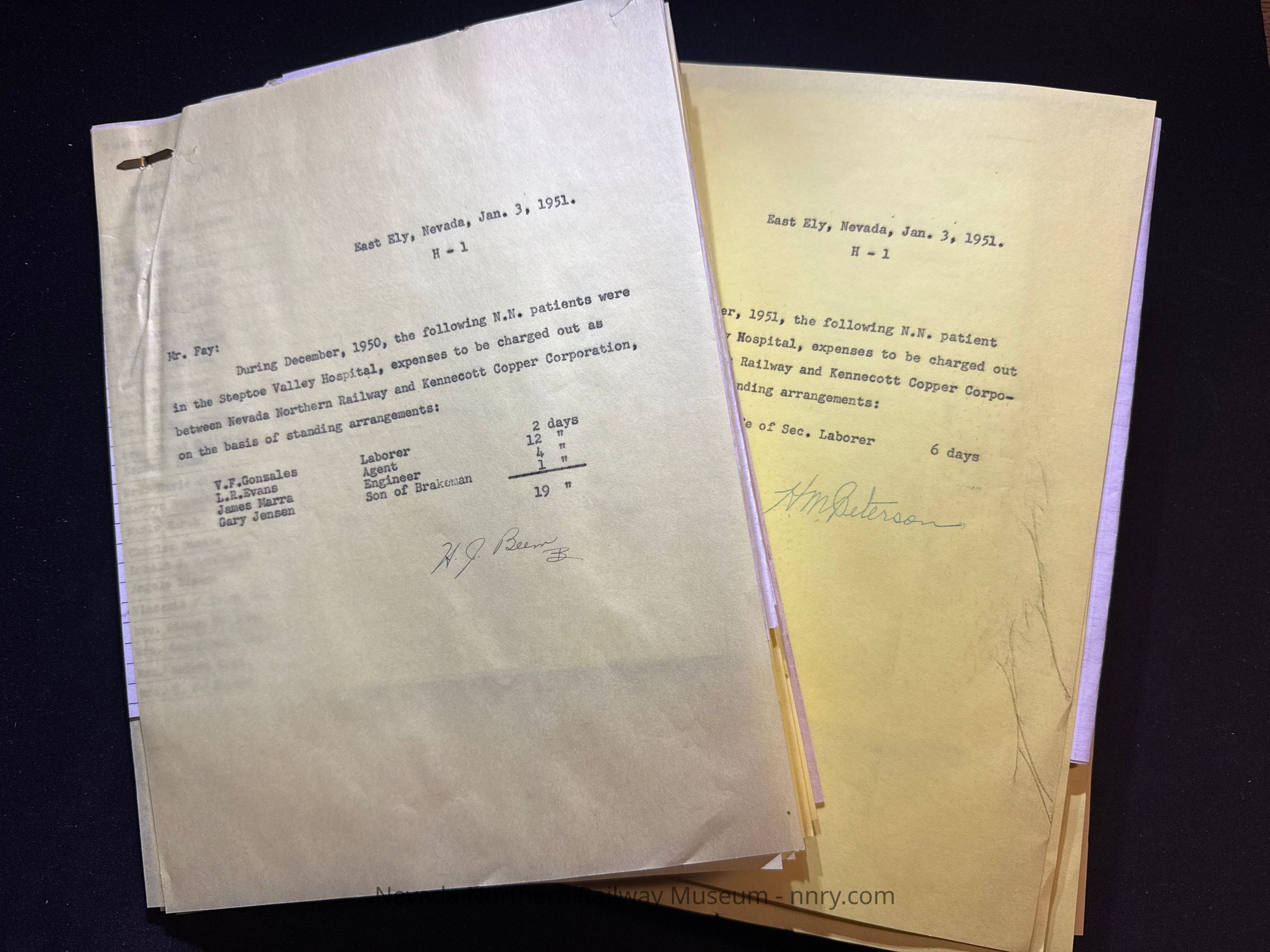 Various correspondence and reports regarding employees admitted to the Steptoe Valley Hospital, 1950-1951.
