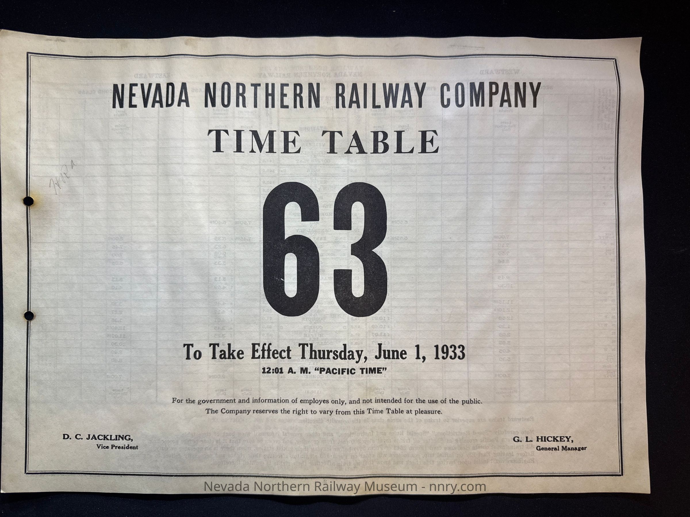 Nevada Northern Railway timetable no. 63, June 1, 1933