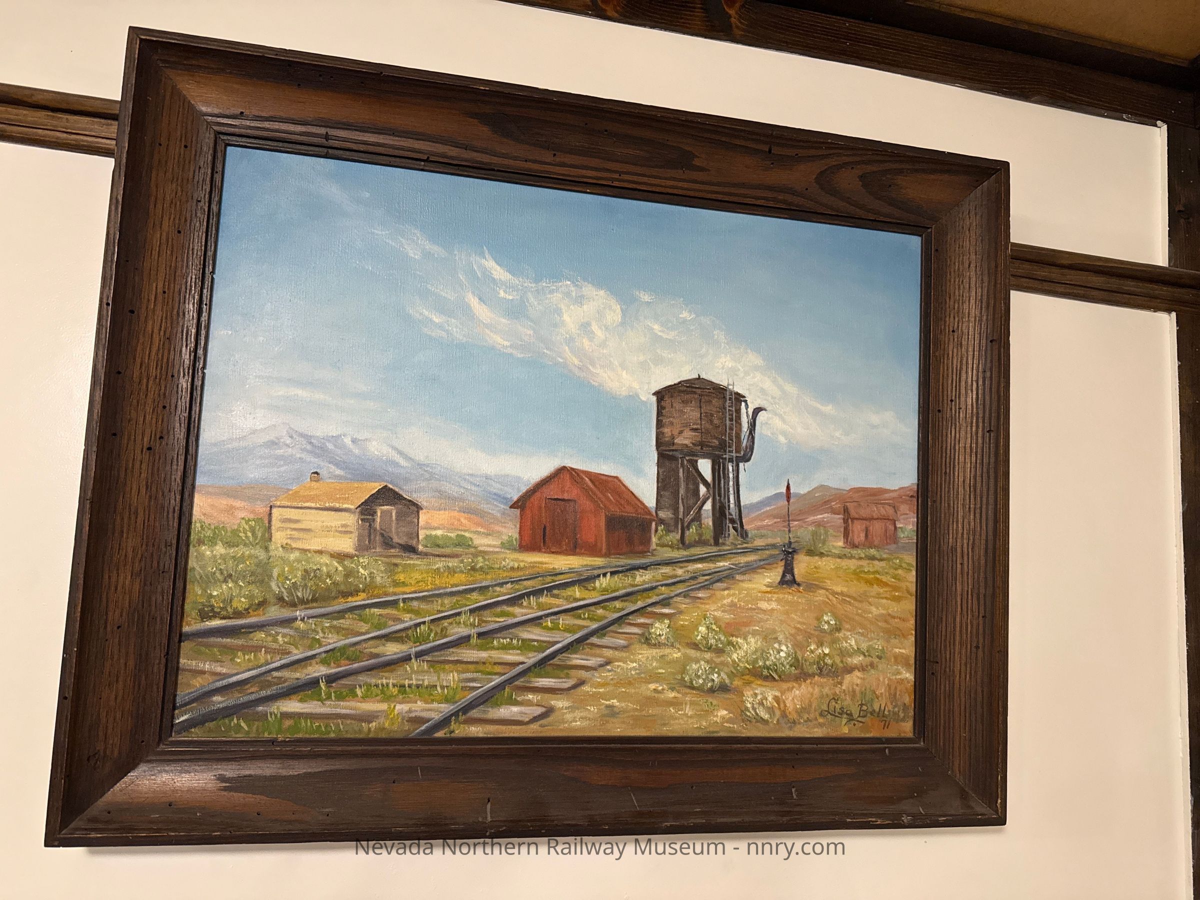 Oil painting of McGill Junction showing water tank and section buildings, Lisa Bell, 1971.Category