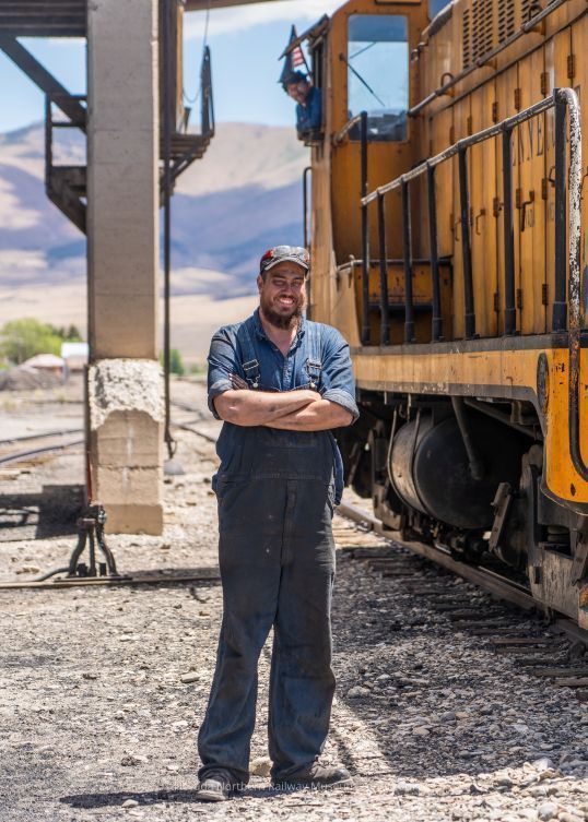 Master Mechanic John Henry McDonnell next to locomtoive #801, Trainmaster Con Trumbull leaning out of cab window in the background, July 1, 2022.Photograph Details