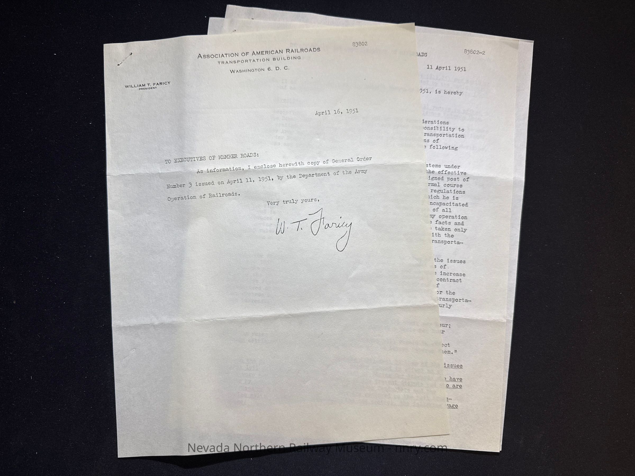 Correspondence regarding the Army's General Order Number 3 on the Operations of Railroads, April 16, 1951.Creator