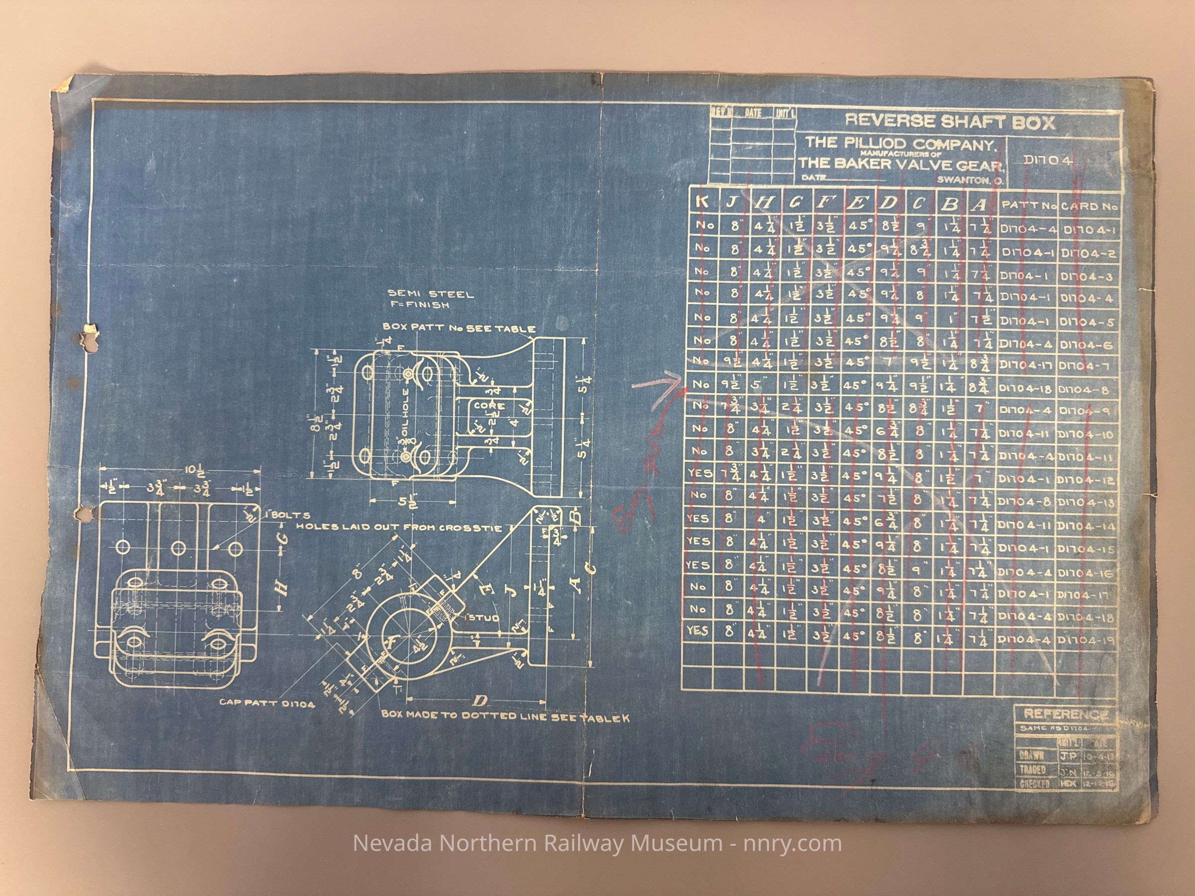Blueprint for the reverse shaft box of the Baker valve gear on locomotive #40, October 4, 1913.