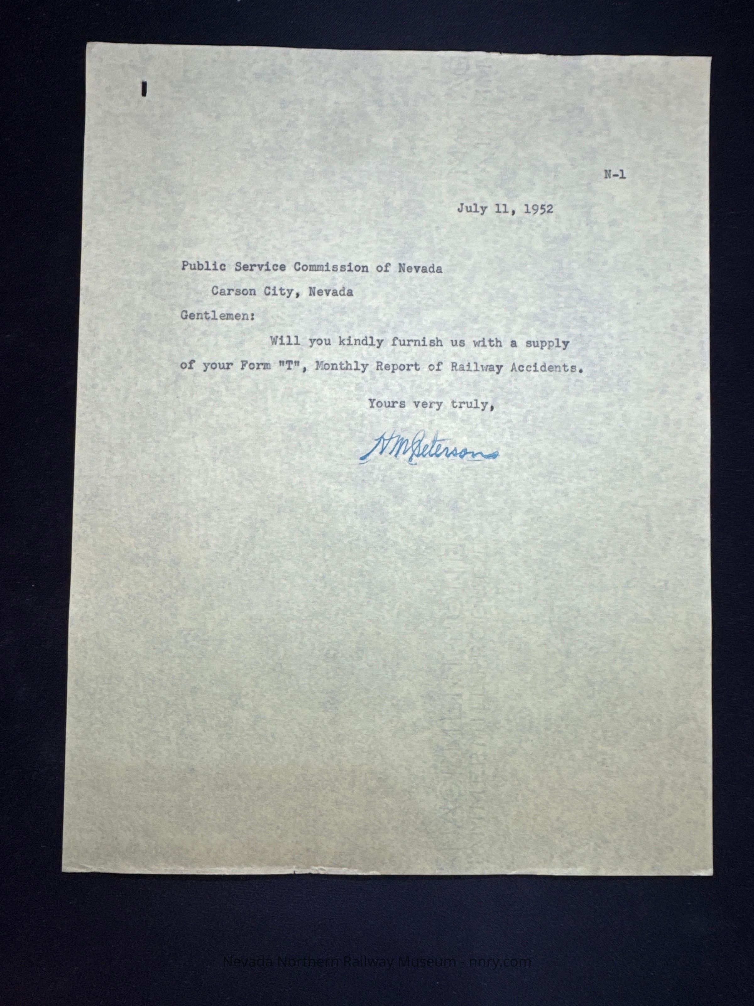 Correspondence to the PSC requesting their form "T," monthly report of railway accidents, July 11, 1952.