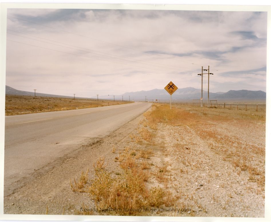 Approach to the wig wag crossing signal on the highway crossing at McGill with swinging signal replaced by a beacon light, October 1965.Photograph Details