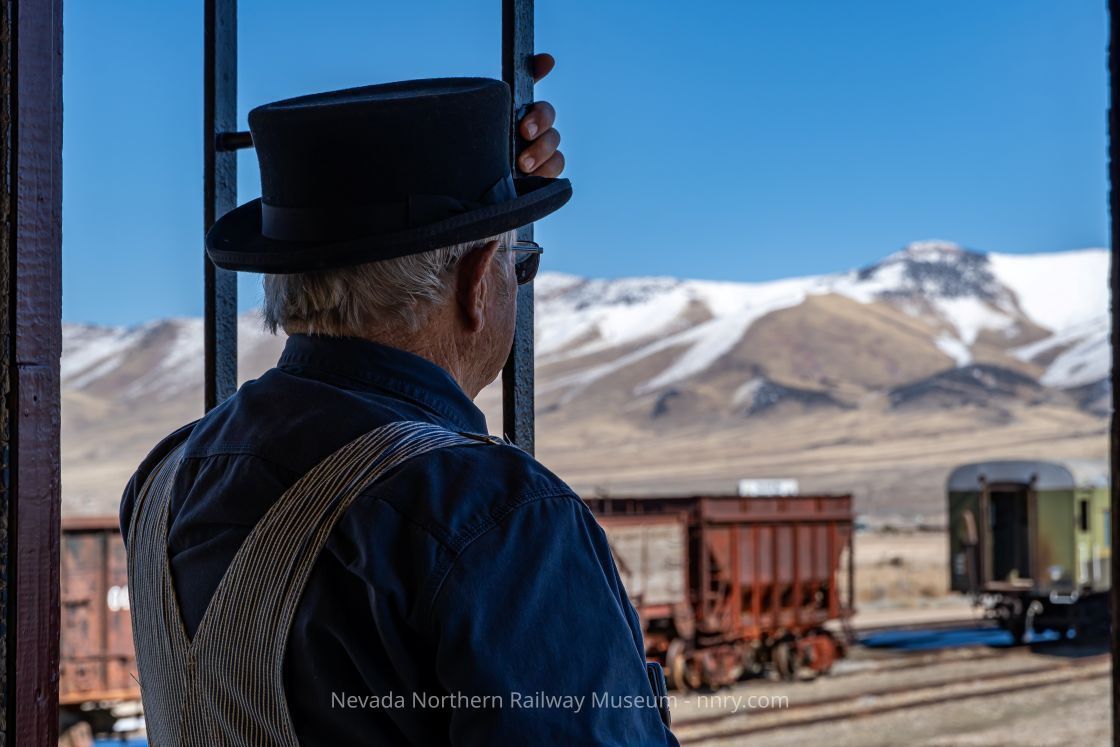 Conductor Bill Hohlt protects the shoving movement on the back platform of caboose #22, February 2024.
