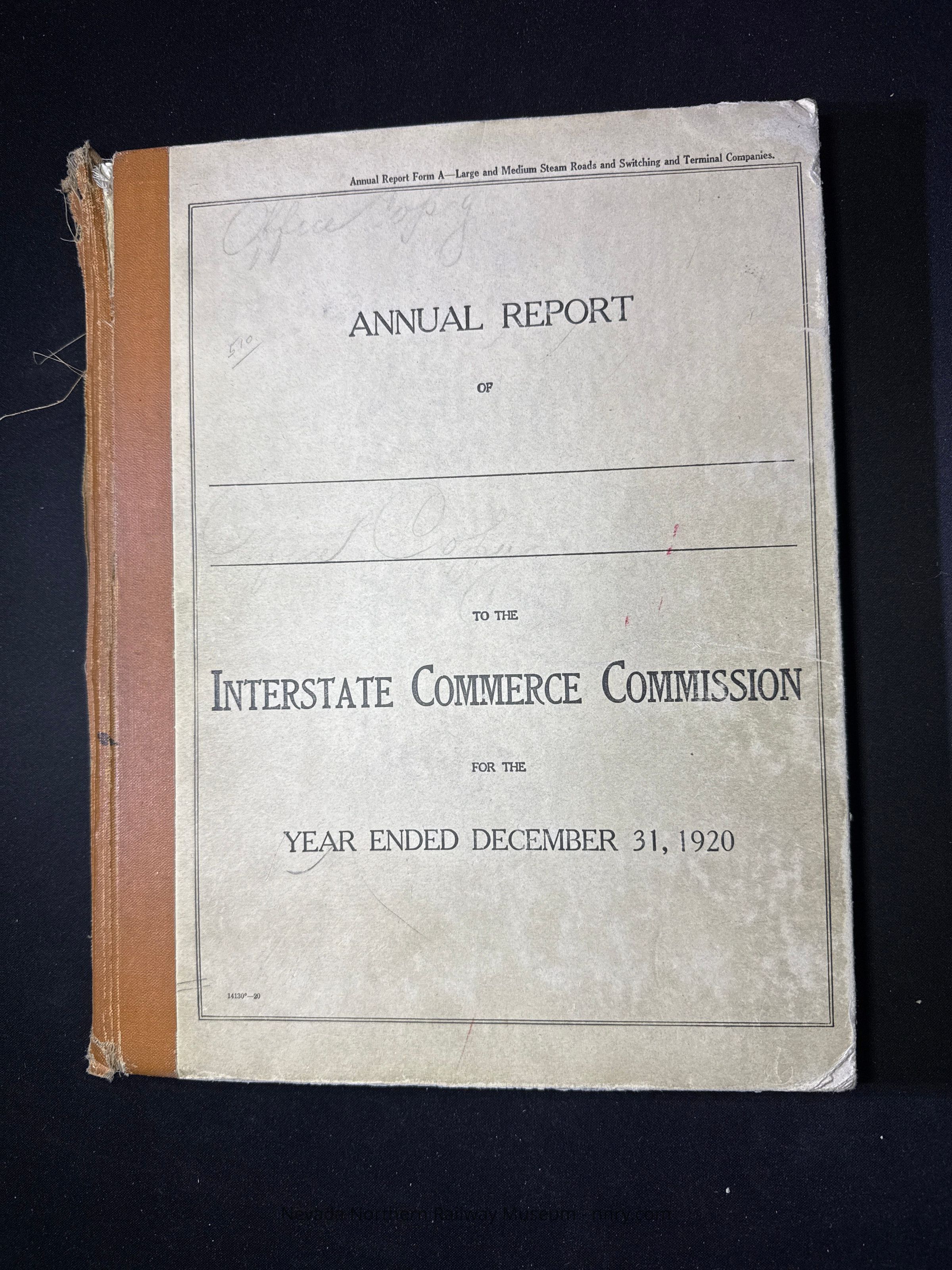 Annual report from the NNRy to the ICC for 1920, includes additional sheet of information between the pages, office file copy for the Auditor's office in East Ely.Creator