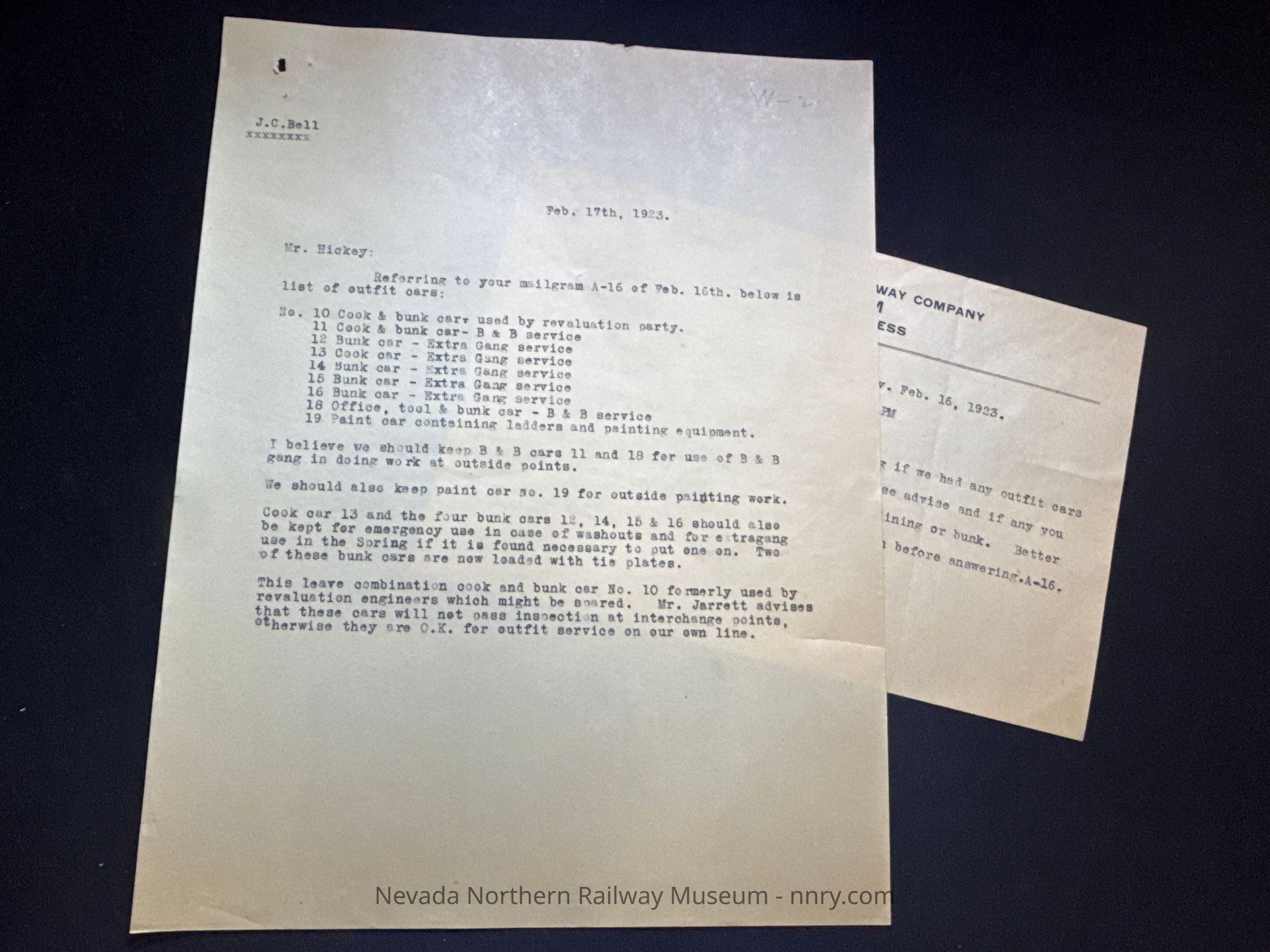 Correspondence regarding the bunk cars on the NNRy and a request by the WP to lease some, February 1923.