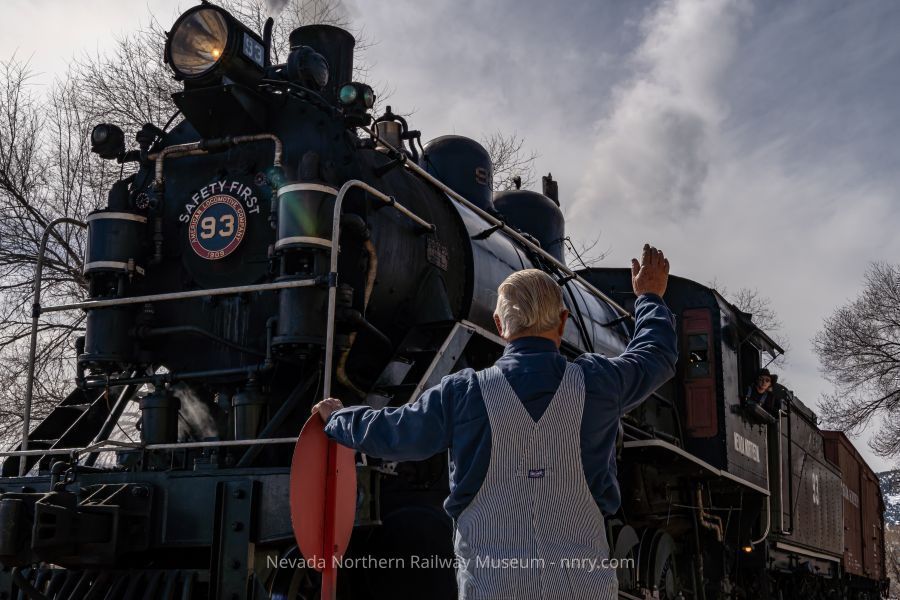 Locomotive #93 passing through switch, Conductor Bill Hohlt at switchstand giving signal, Will Ebbert, fireman, in cab window, February 2024.