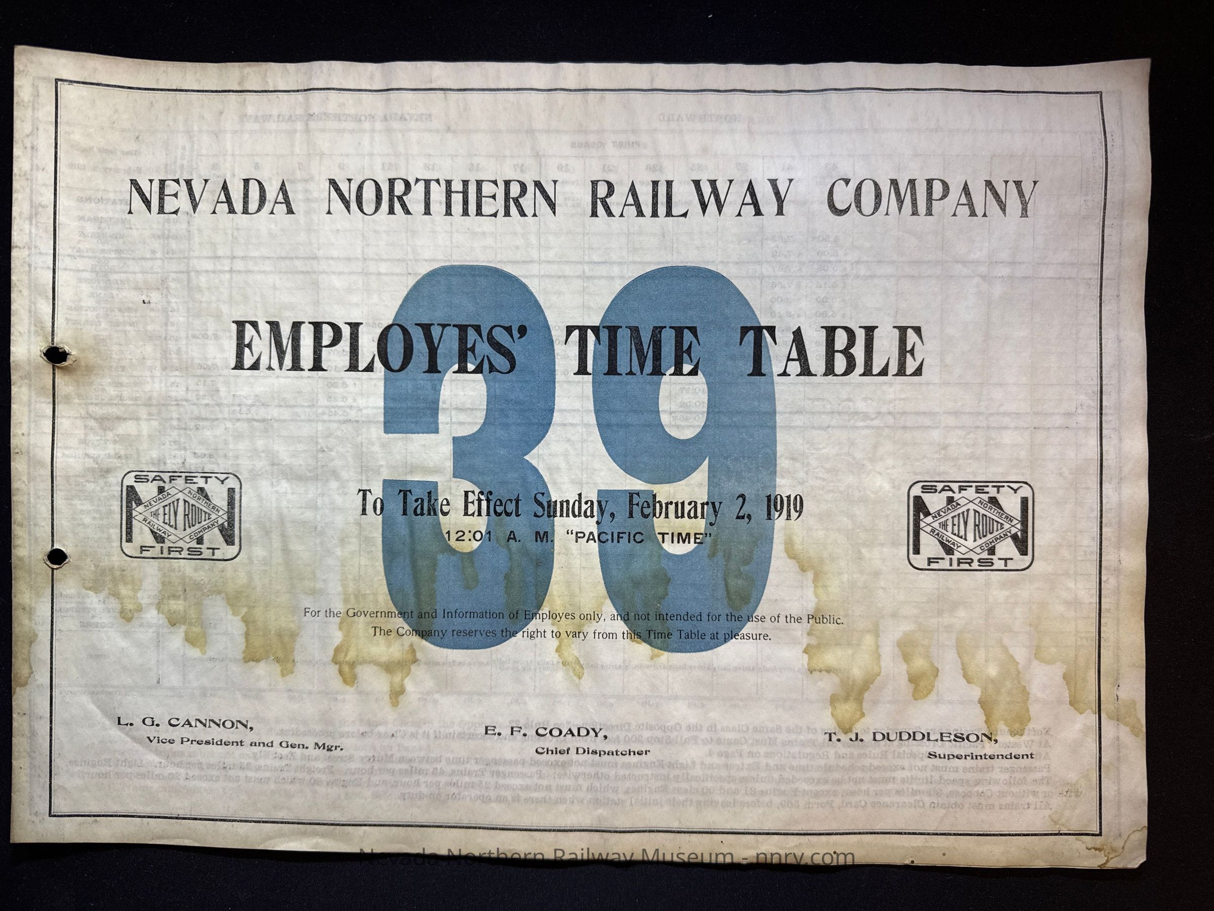 Nevada Northern Railway timetable no. 39, February 2, 1919.