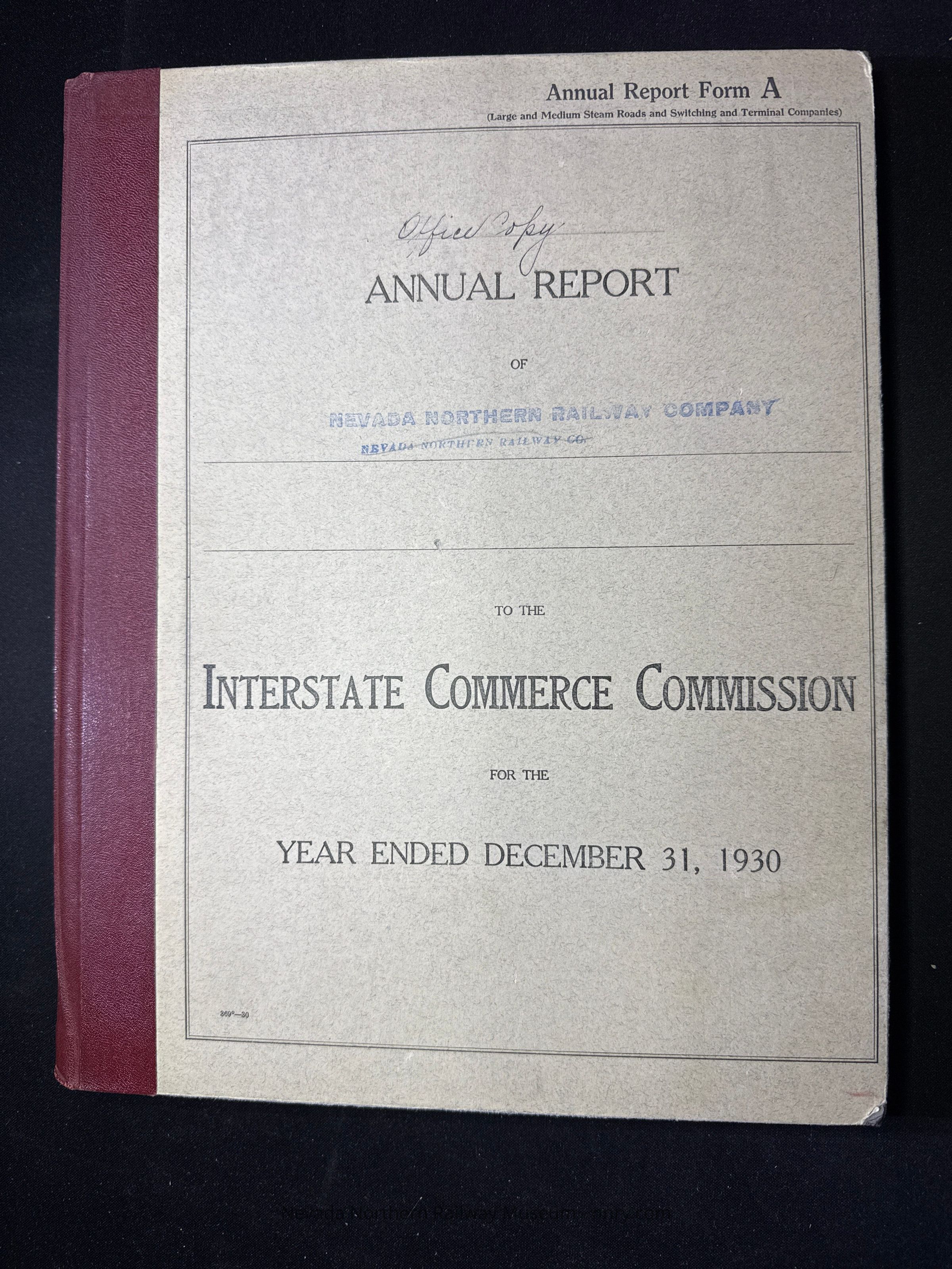 Annual report from the NNRy to the ICC for 1930, includes additional sheet of information between the pages, office file copy for the Auditor's office in East Ely.Creator