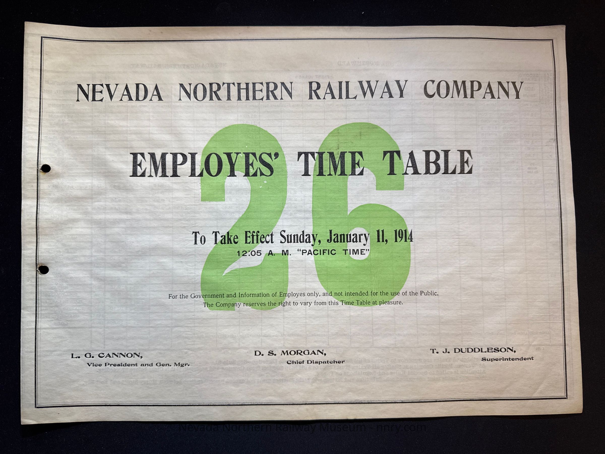 Nevada Northern Railway timetable no. 26, January 11, 1914.