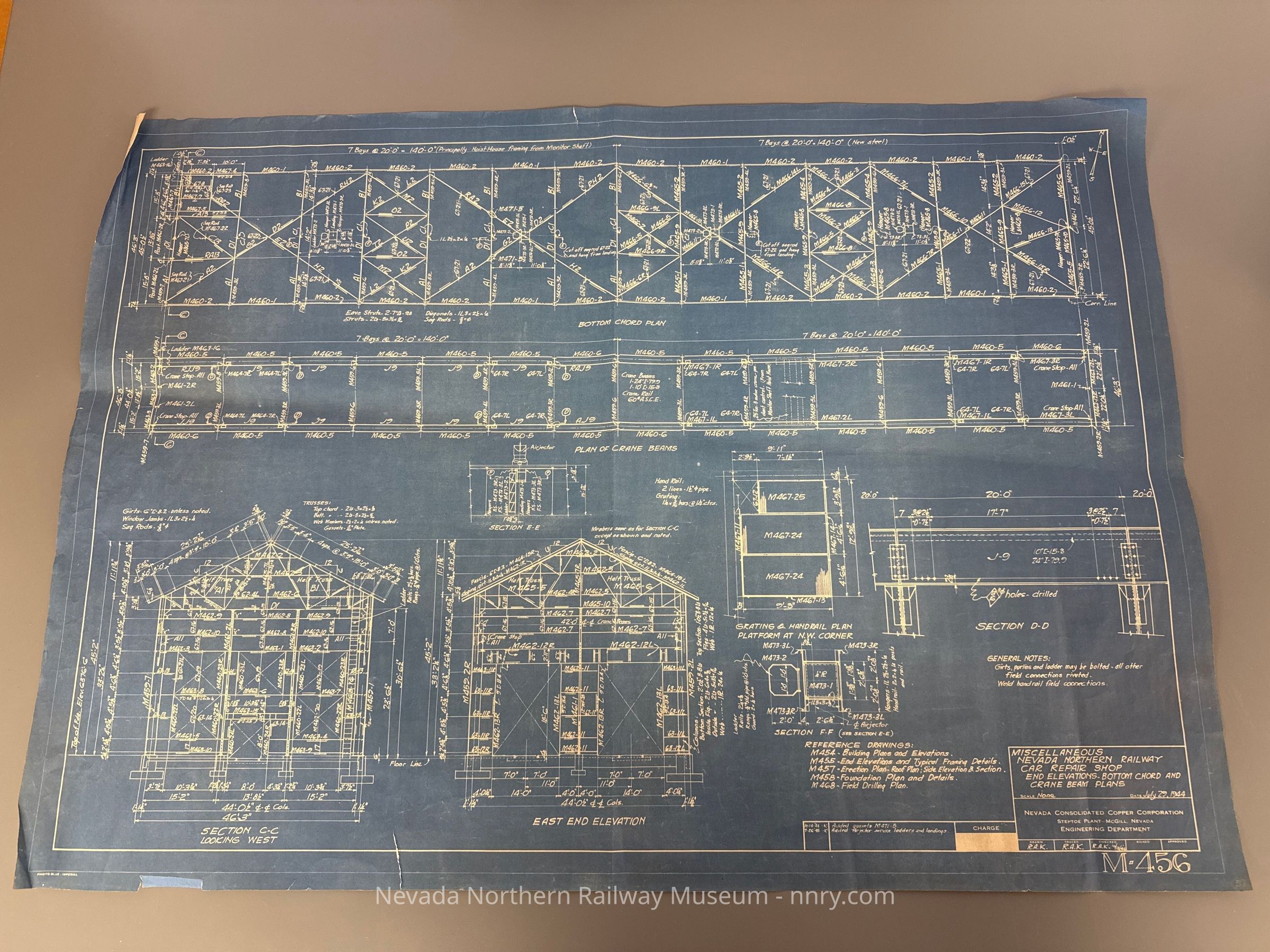 Blueprint of the RIP building showing the building ends and the crane beams, July 29, 1944.