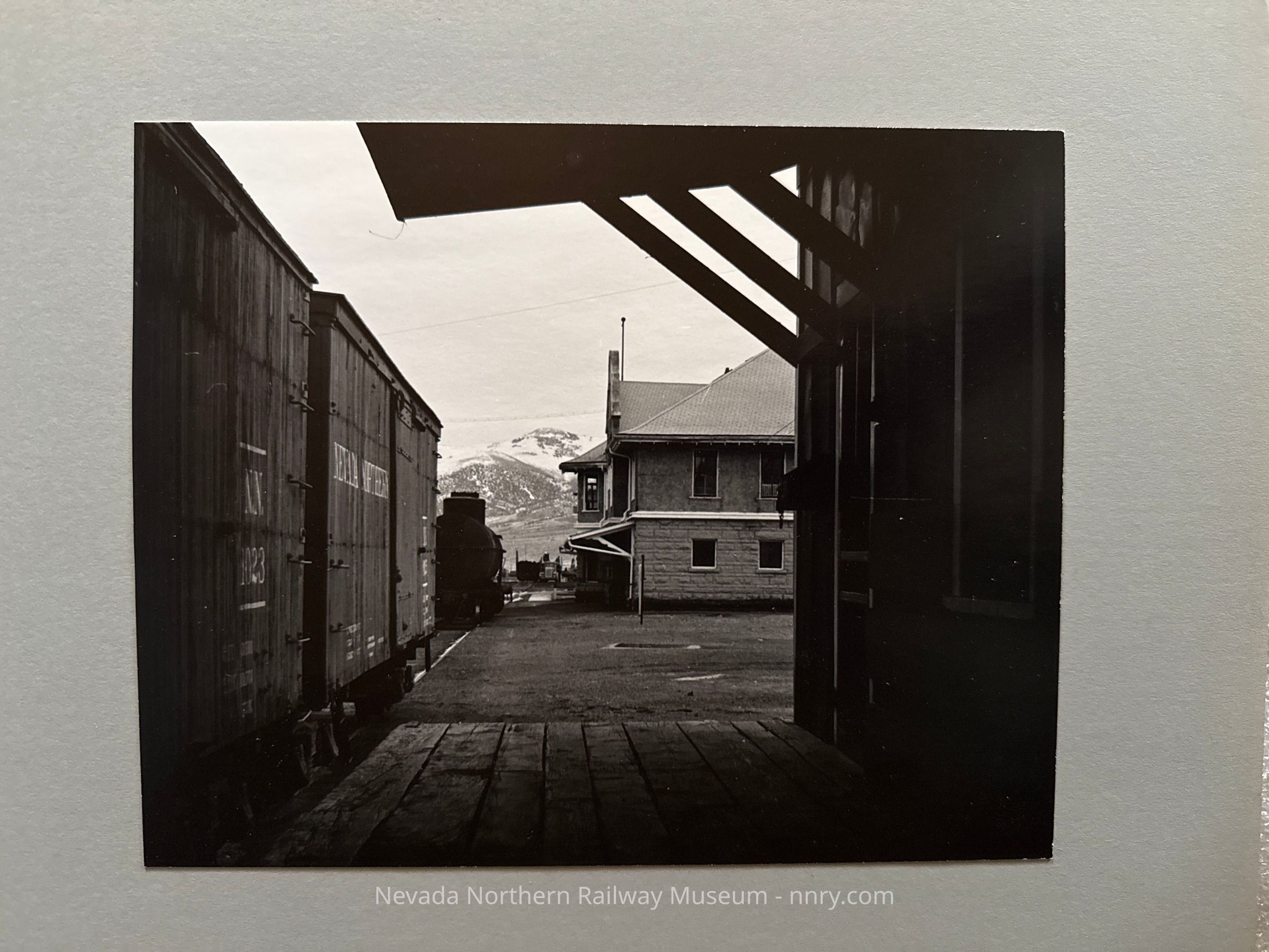 View of the East Ely Depot from the platform of the freight barn, freight cars on the team track. Believed to have hung in the general offices.