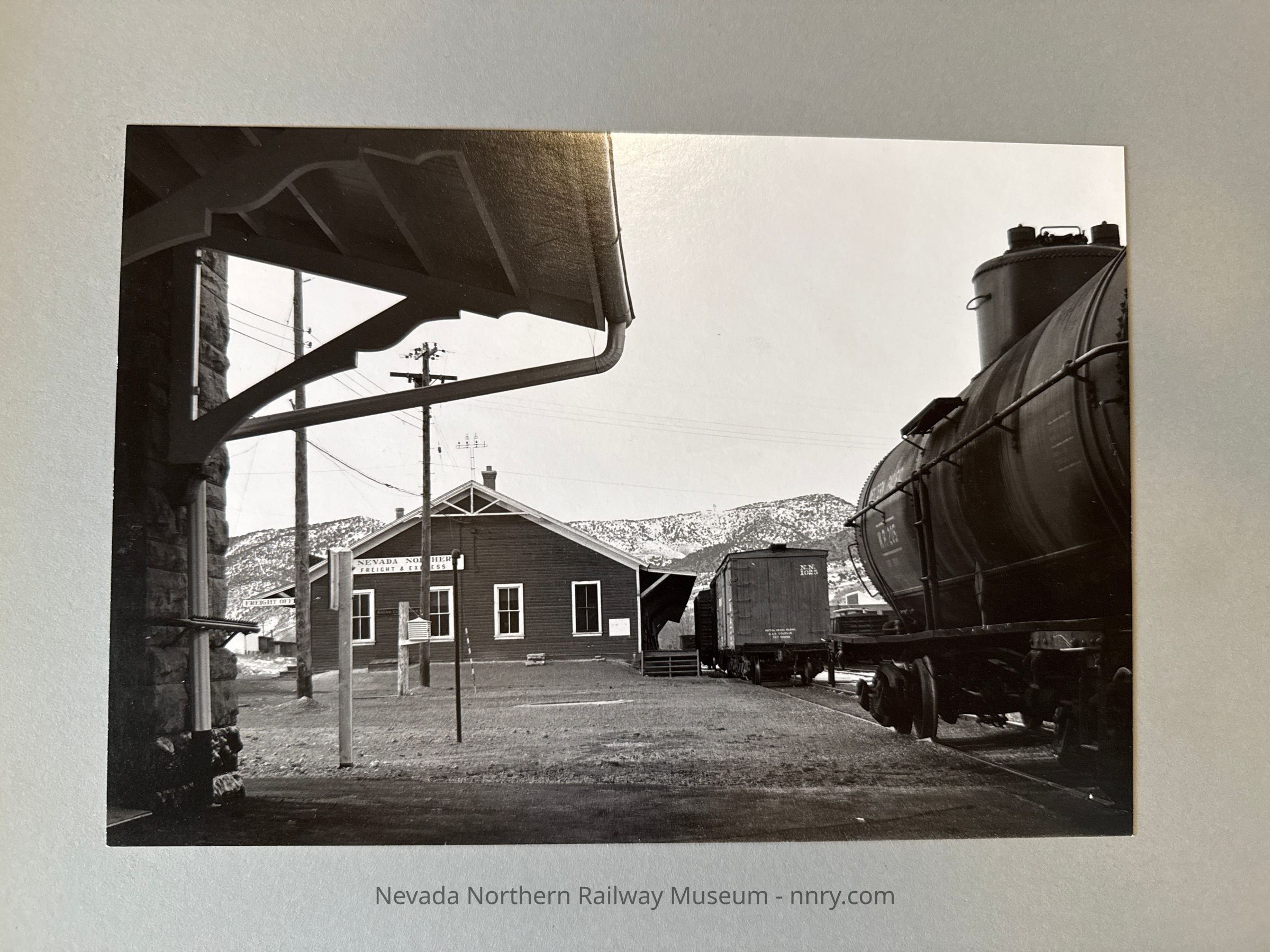 East Ely freight barn and freight cars viewed from the depot platform. Believed to have hung in the general offices.