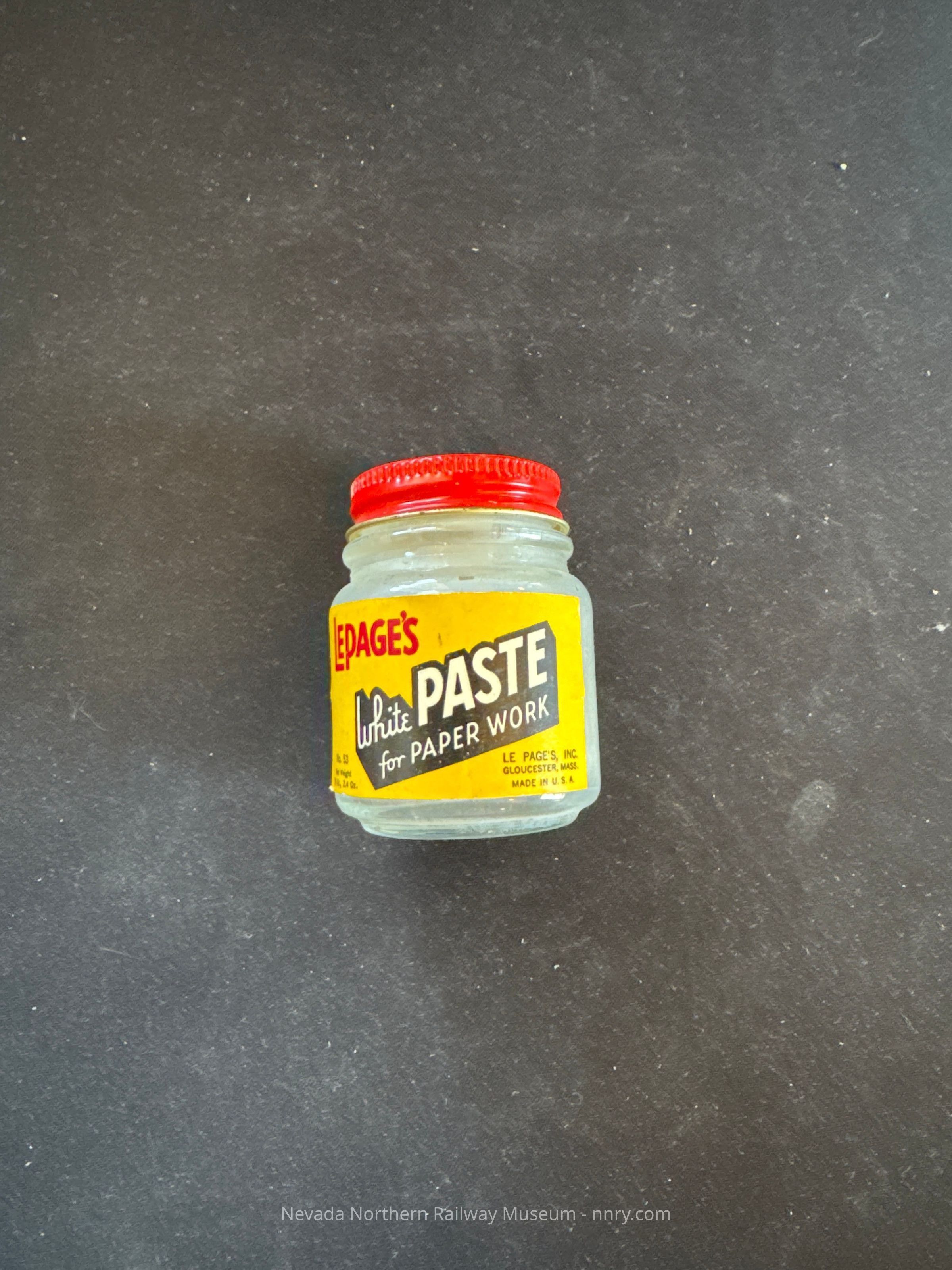 Jar of Le Page's white paste for paper work, paste appears to have dried into a crystalline form.Made/Created