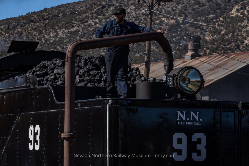 Locomotive #93 being watered by the Vince Whiteley, February 2024.