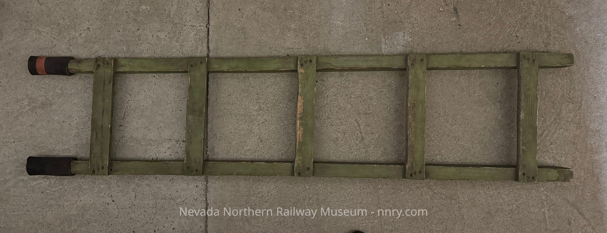 Wooden ladder with 5 rungs and rubber wrappings at the top to lean against shelves.