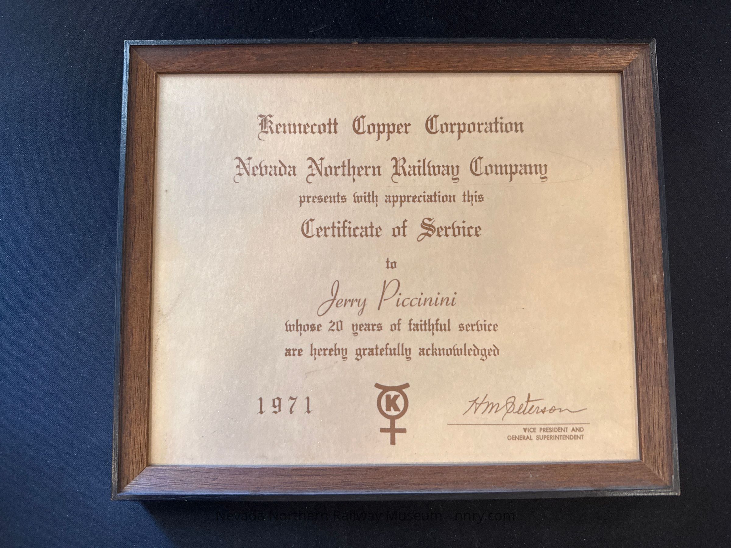 Certificate of Service presented to Jerry Piccinini for 20 years of service, 1971.Category
