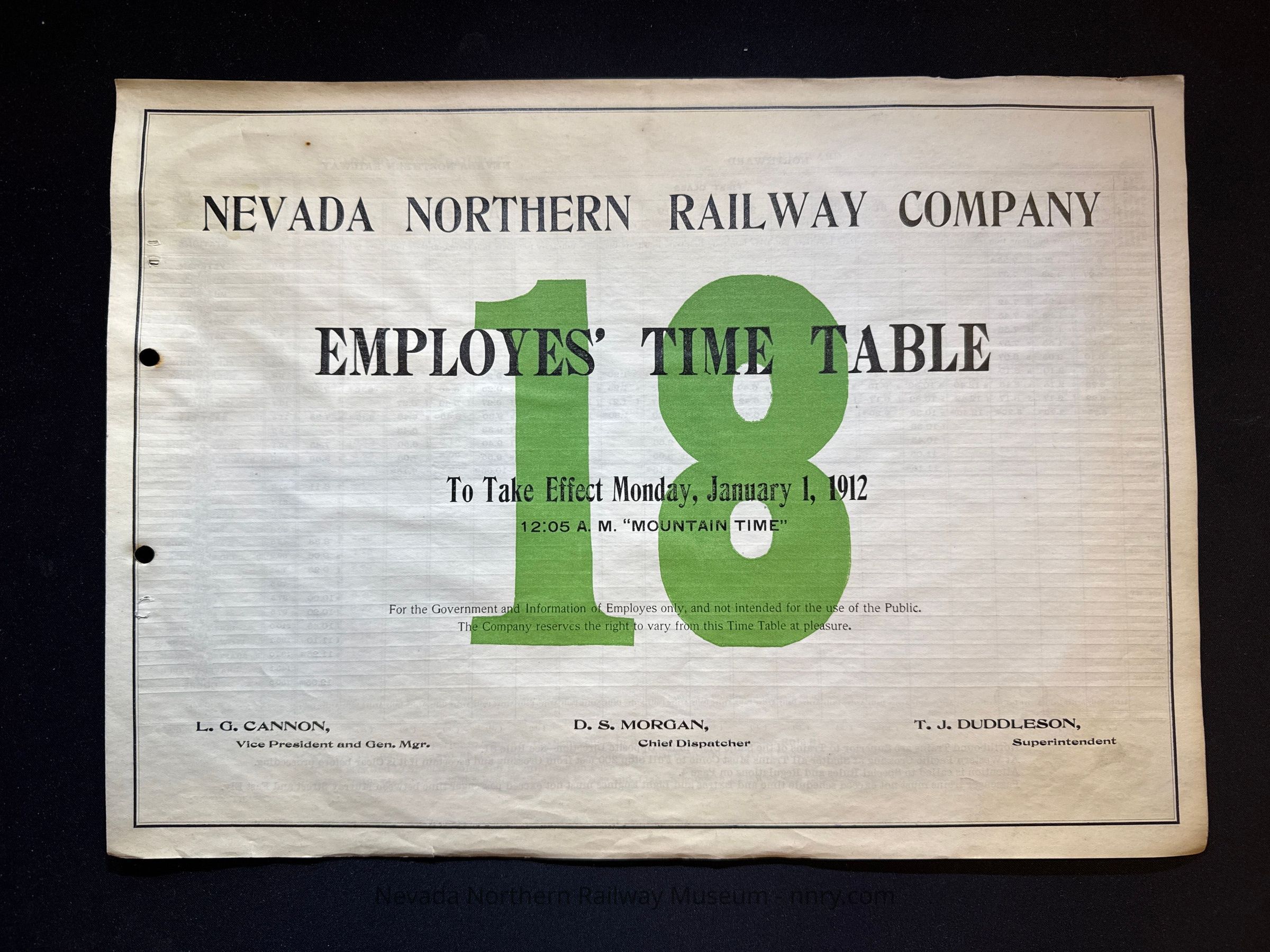Nevada Northern Railway timetable no. 18, January 1, 1912.
