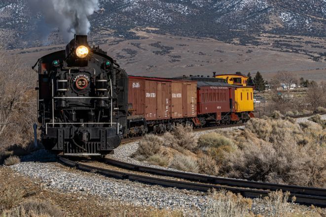 Locomotive #93 with a mixed train on the fill, February 2024.