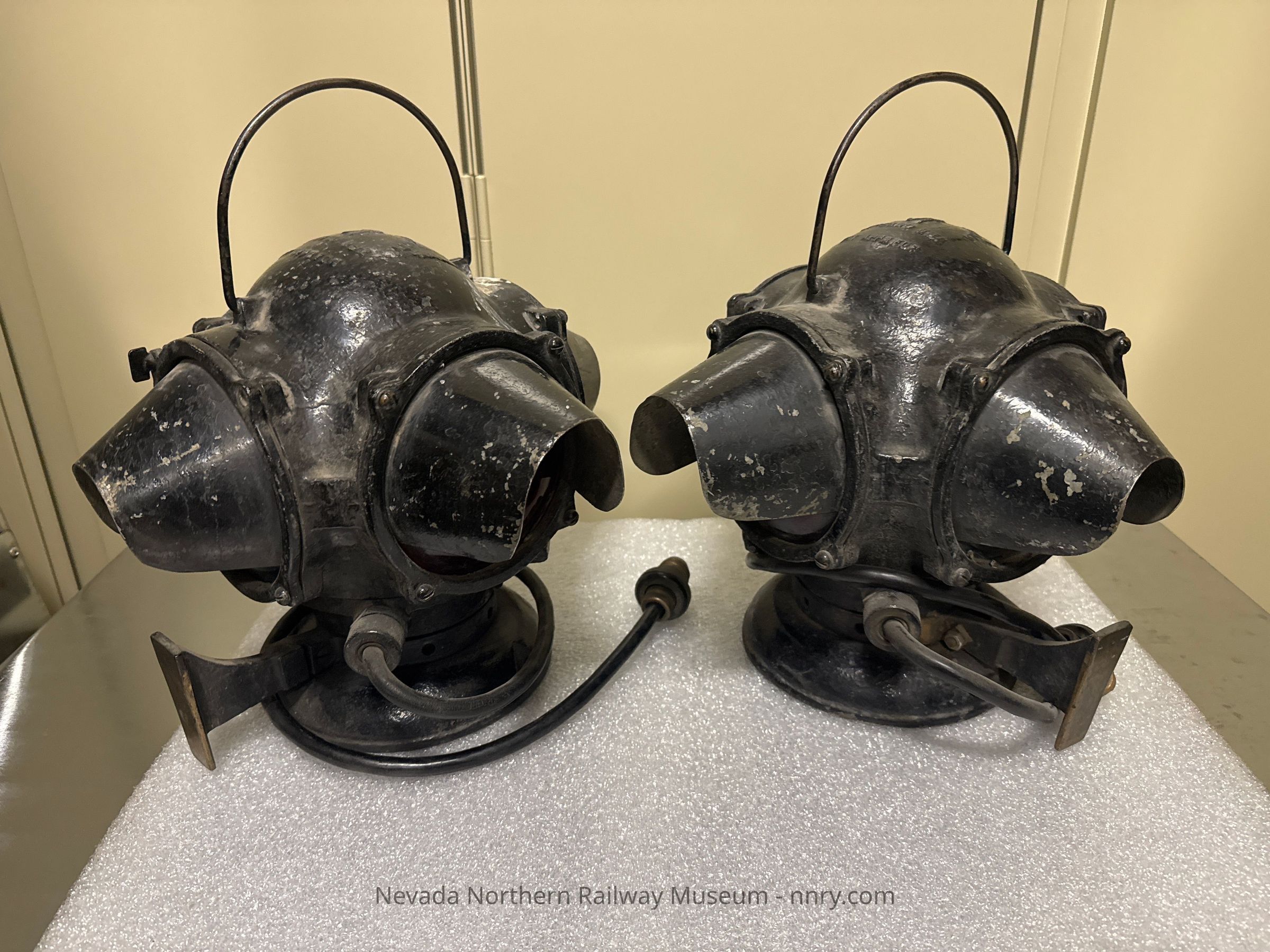 Shrouded marker lamps used during World War 2, Pyle National, black with three green lenses and one red, electric light with power cord, believed to have been used on the NNRy, circa 1940s.Category