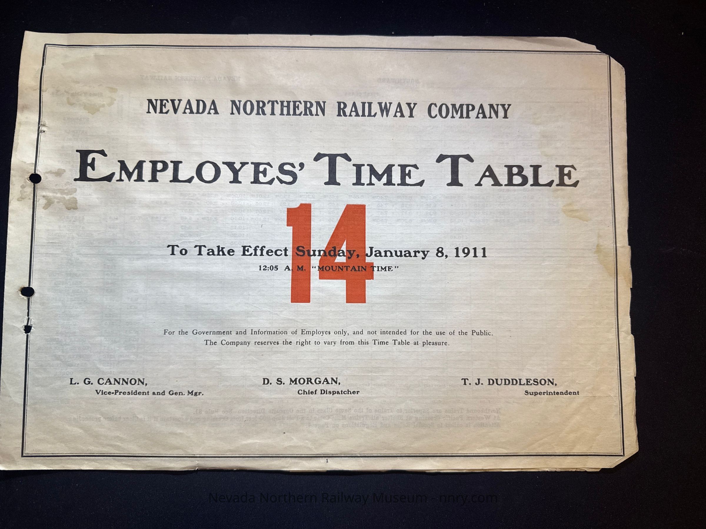 Nevada Northern Railway timetable no. 14, 1-8-1911.