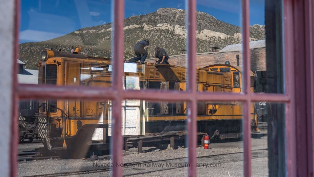 Reflection of locomotive #801 in a window on the compressor room, Master Mechanic John Henry McDonnell and Shop Foreman Lennox Purinton on top of the locomotive, July 1, 2022.Photograph Details