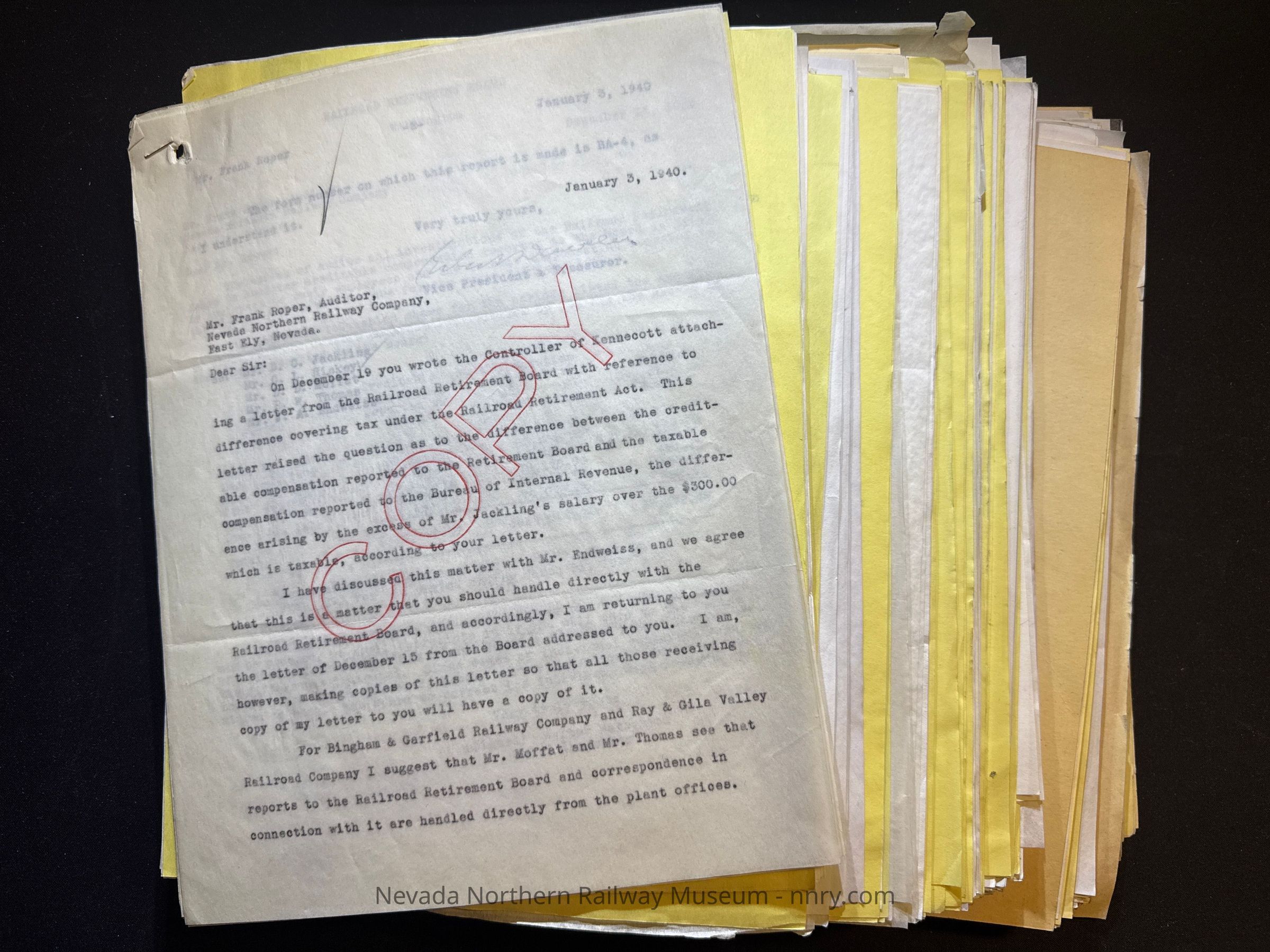 Various correspondence and reports related pensions for employees under the railroad retirement act, 1938-1939.