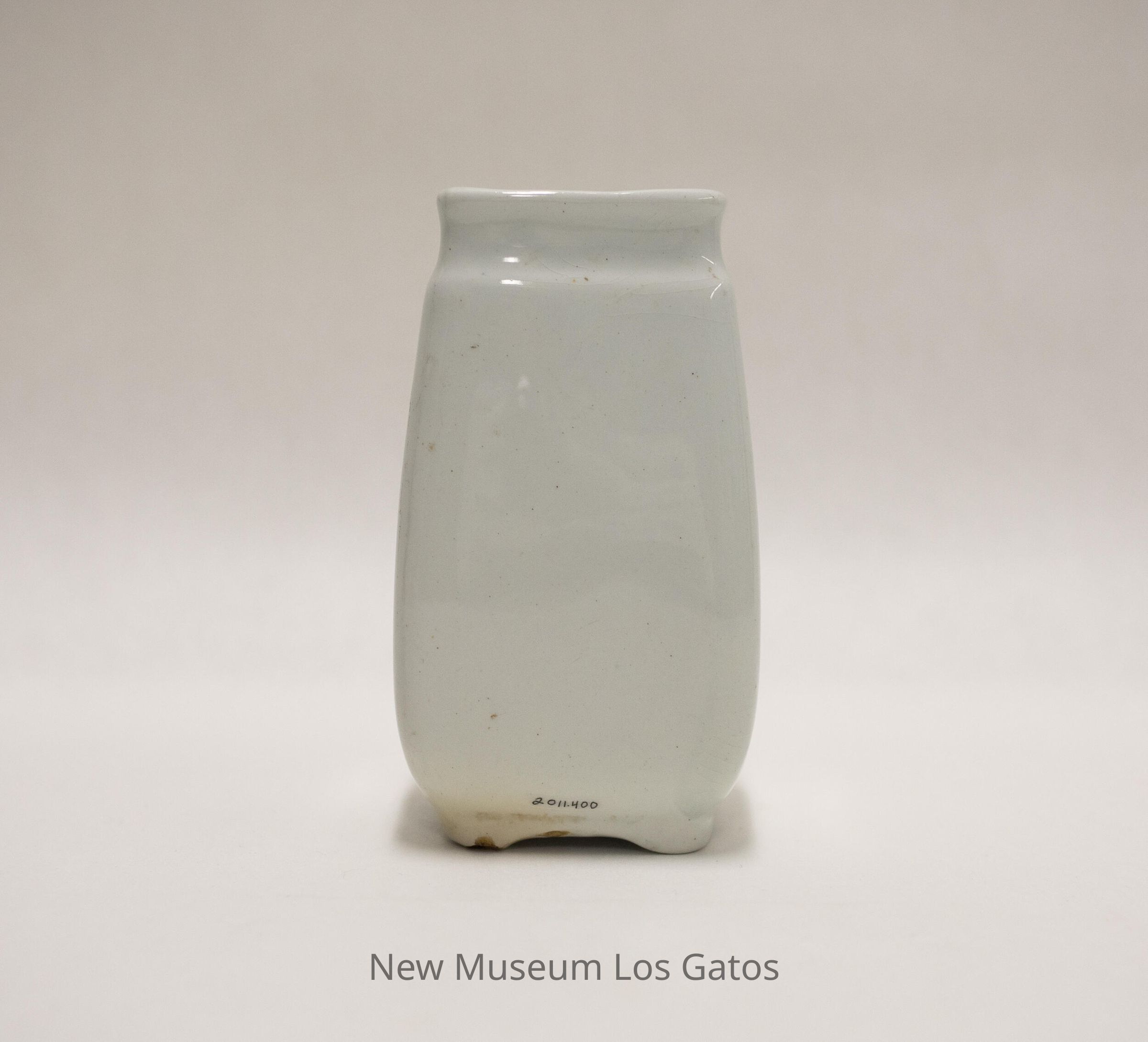 A white, ceramic toothbrush holder. The top of the holder is square, and corners bump out a bit down the sides, giving the body a more rounded appearance. There is a bevel around the top, and small feet at the bottom.Collection