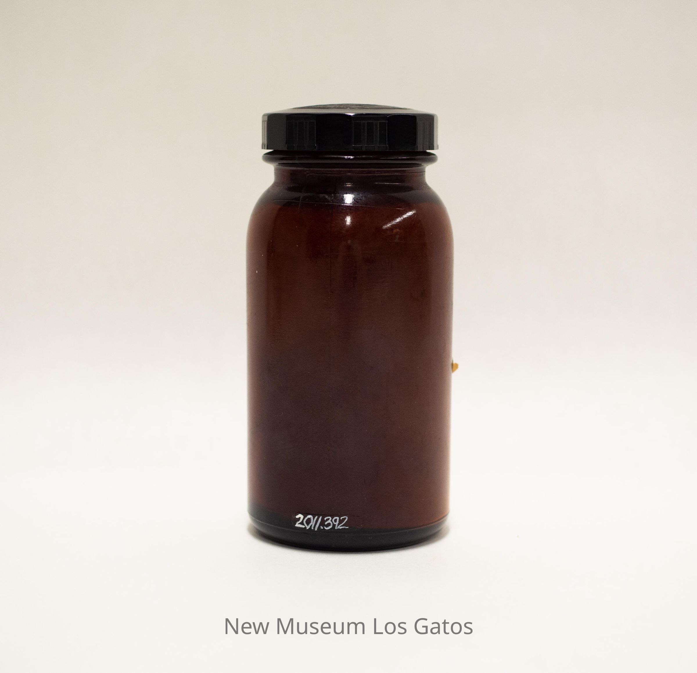 A small, amber-colored bottle of powdered licorice extract. The bottle appears to be about two-thirds of the way full. The lid of the bottle is a black plastic screw-top, and there is a label attached to the front of the bottle.