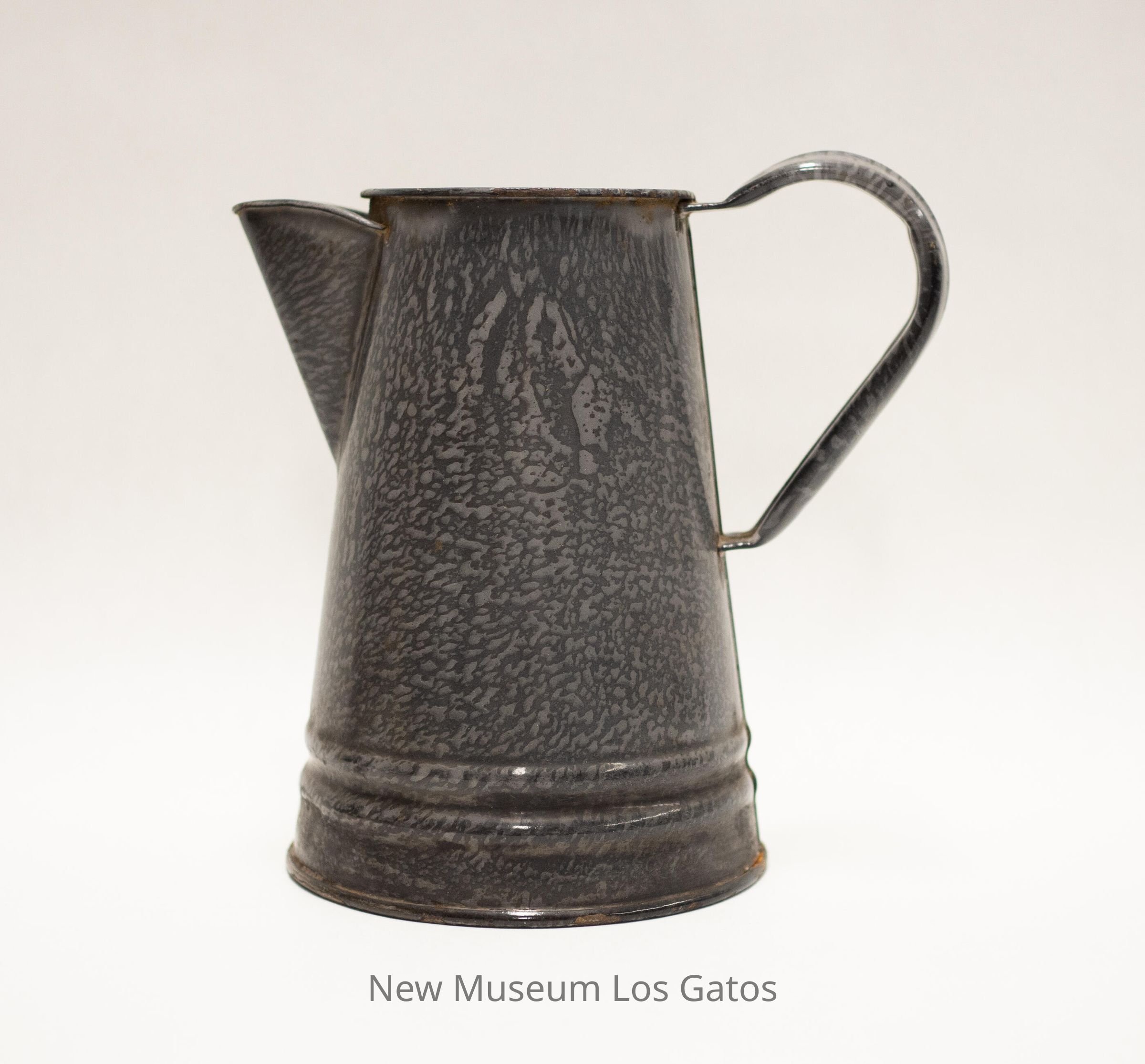 A gray, enameled metal pitcher. The pitcher is wider at the base, and tapers towards the rim. There is a handle attached to the side of the pitcher, and opposite the pitcher is a spout; there are holes in the side of the pitcher, directly behind the spout. There are two decorative, raised bands around the base of the pitcher.Collection