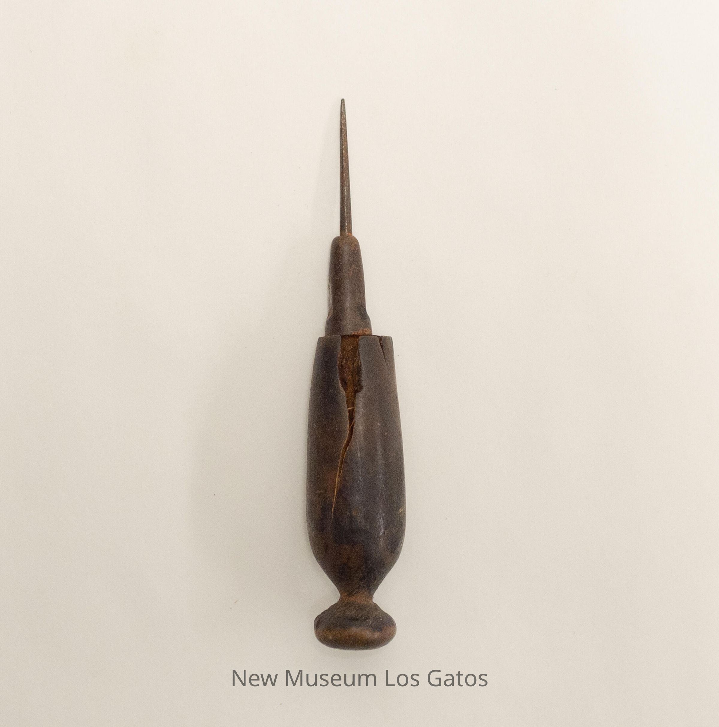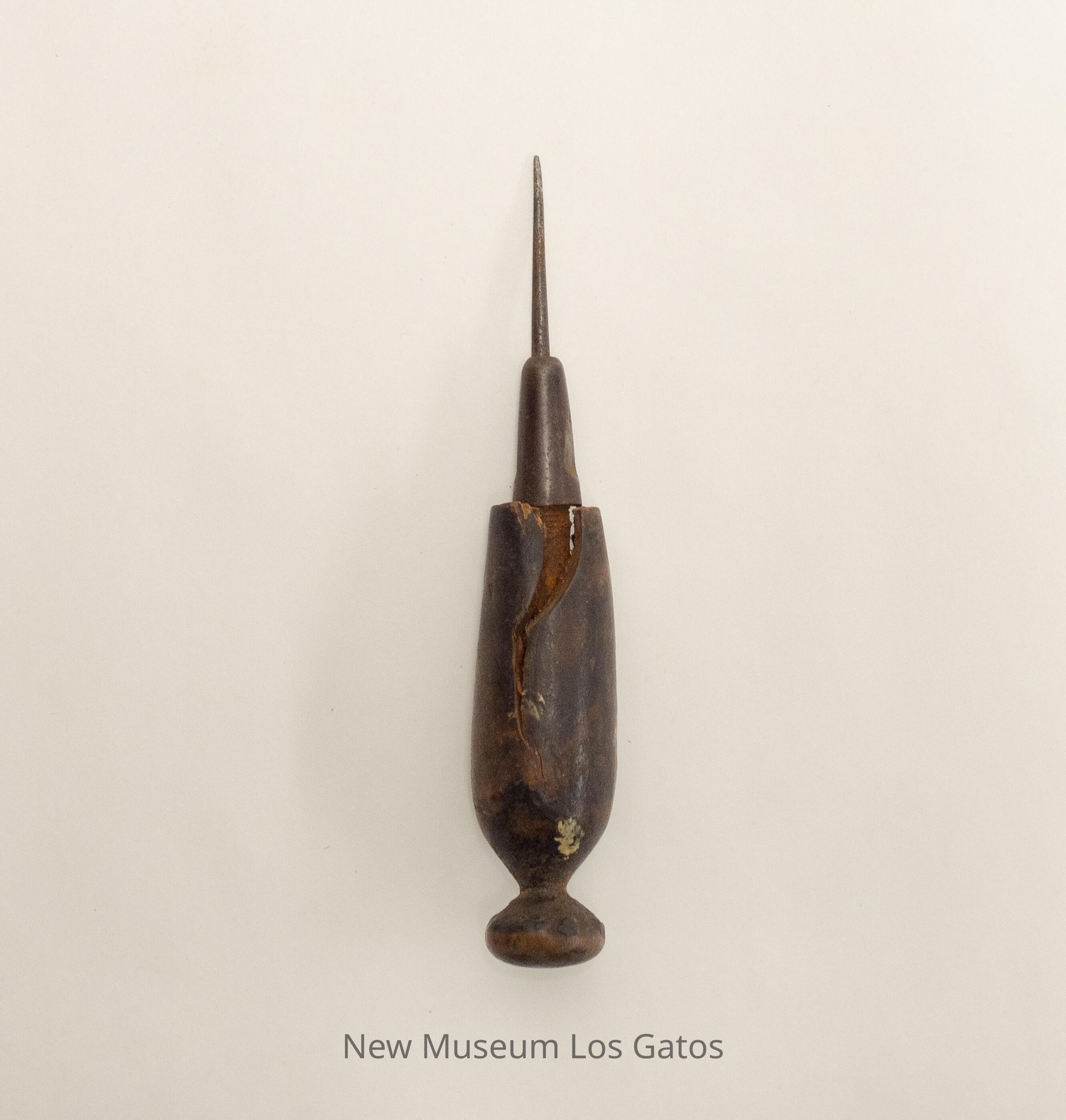 A small, metal awl with a teardrop-shaped wooden handle. The wooden handle has a small wooden knob attached to the base.Collection