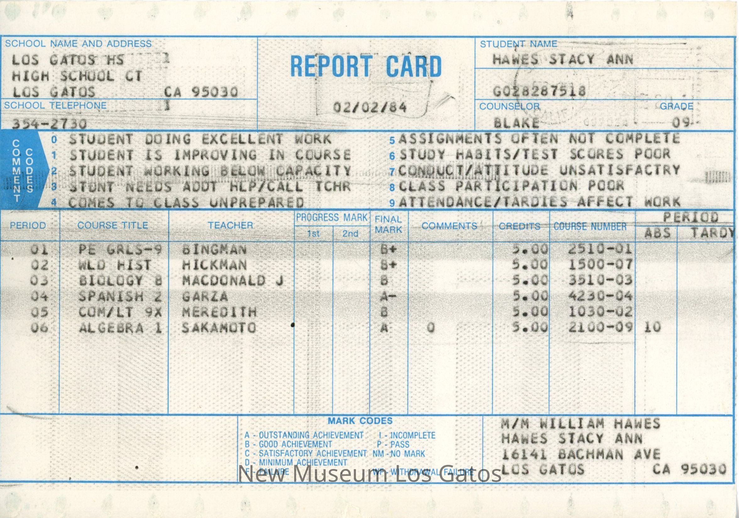 A single, half sheet of paper with Stacy Hawes' grades in her second semester of 9th grade at Los Gatos High School. The pre-printed boxes and information is blue, while the typed information relevant to Stacy is in black ink.